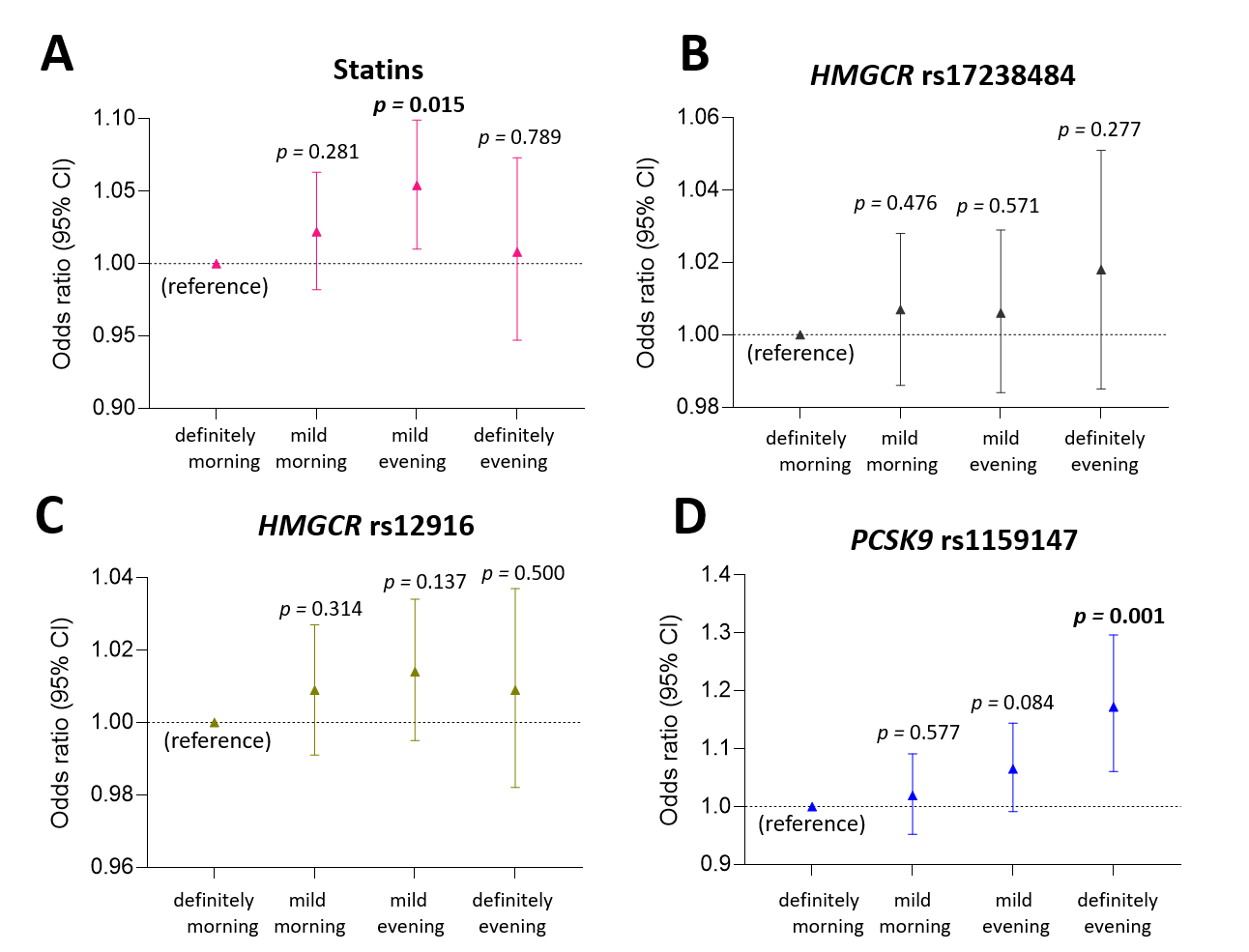 We did not observe any association of either statin treatment or HMGCR gene variants with chronotype (Fig. 3A‒C). In contrast, each additional copy of the PCSK9 rs11591147-T allele was associated with 15.9% greater odds for evening preference [95% CI, 1.06 to 1.30; p = 0.001] (Fig. 3D). Moreover, when the analyses were restricted to compare only definitely evening preference with definitely morning preference, PCSK9 rs11591147-T allele was associated with 17% greater odds for evening preference [95% CI, 1.05 to 1.29; p = 0.003] (Table 3).