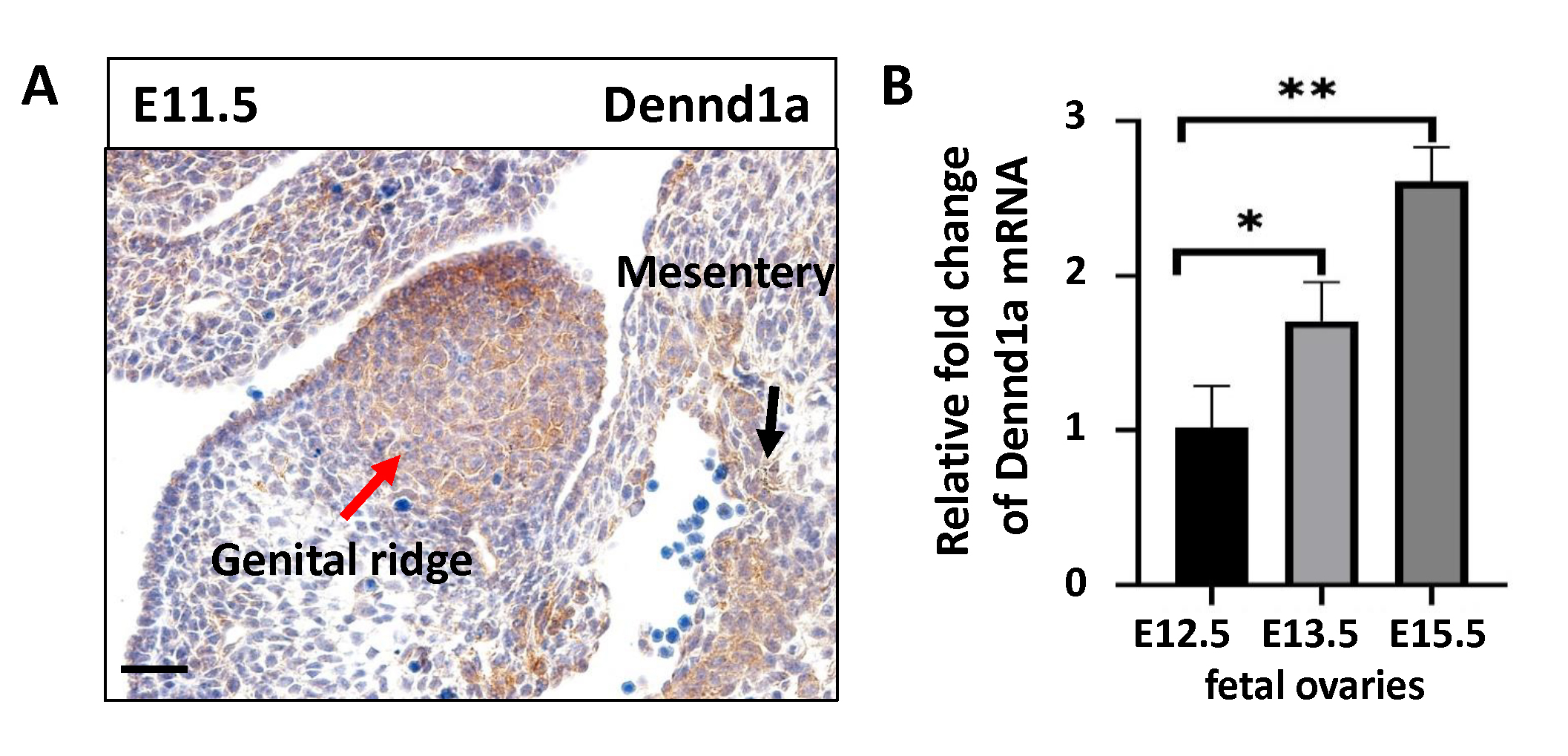 the fetal ovary lacking Dennd1a. (A,B) Real time PCR and Western blot show the