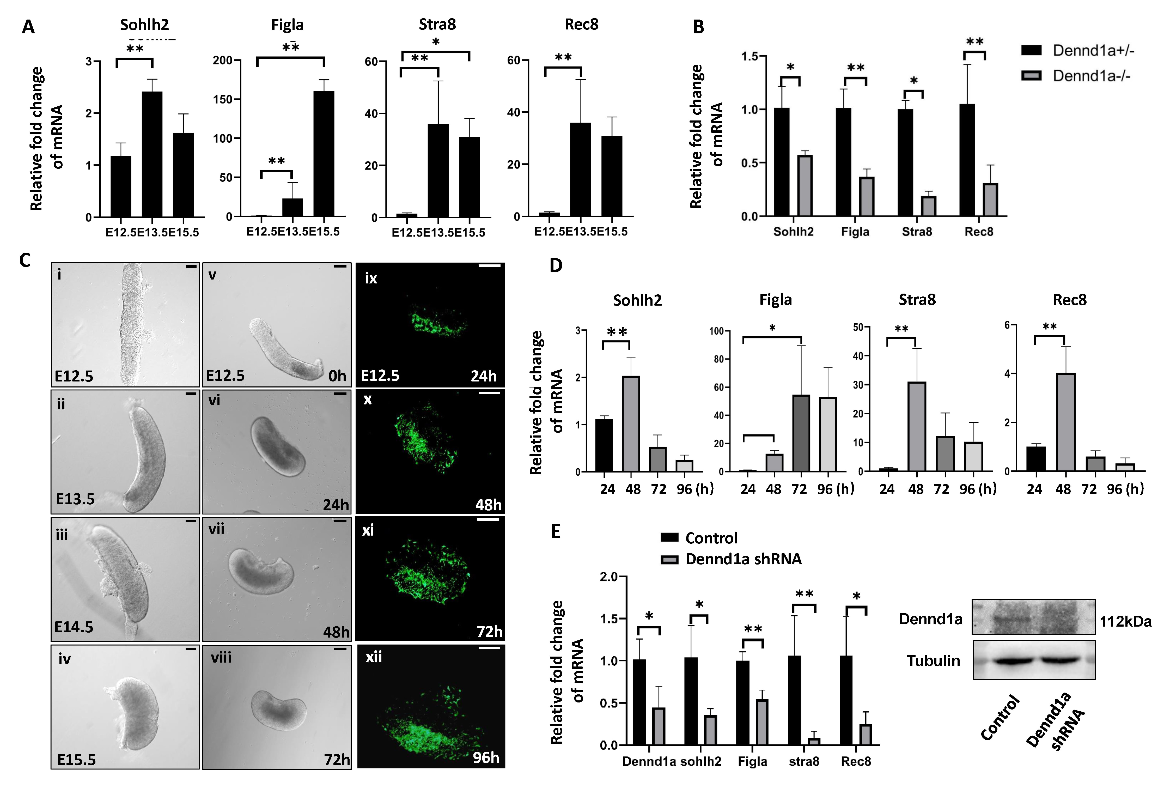 Since homozygous Dennd1a-/- mutants die circa E14.5, they are not suitable to determine whether loss of Dennd1a eventually disrupts the expression of genes associated with oocyte differentiation and meiotic initiation. Moreover, due to limited availability of Dennd1a-/- gonads, we therefore established an ex vivo gonad culture by incubating genital ridges isolated from E12.5 wild-type female embryos. The long and narrow E12.5 gonads ex vivo became short and thick after being cultured for 24, 48, and 72 h (Fig. 2C, v–viii), recapitulating the morphological changes of developing gonads in vivo from E13.5 to E15.5 (Fig. 2C, i–iv). The mRNA expression of Sohlh2, Figla, Stra8 and Rec8 in wild-type gonads ex vivo were activated after being incubated for 48 h (Fig. 2D), showing a similar expression pattern as that in gonads in vivo at E13.5 (Fig. 2A). To knockdown the expression of Dennd1a, the ex vivo E12.5 gonads were infected with adenoviral Dennd1a shRNA carrying a GFP fluorescent tag for 24, 48, 72, or 96 h (Fig. 2C, ix–xii). After 48 h or longer of infection, the expression of Dennd1a mRNA and protein were decreased to approximately half the wild-type level (Fig. 2E). In gonads with Dennd1a knockdown, the mRNA expression of Sohlh2, Figla, Stra8 and Rec8 were not fully activated, as shown in representative samples treated for 72 h (Fig. 2E). These results suggest that Dennd1a deficiency disrupted the proper activation of genes associated with oocyte differentiation and initiation of meiosis in fetal ovaries.