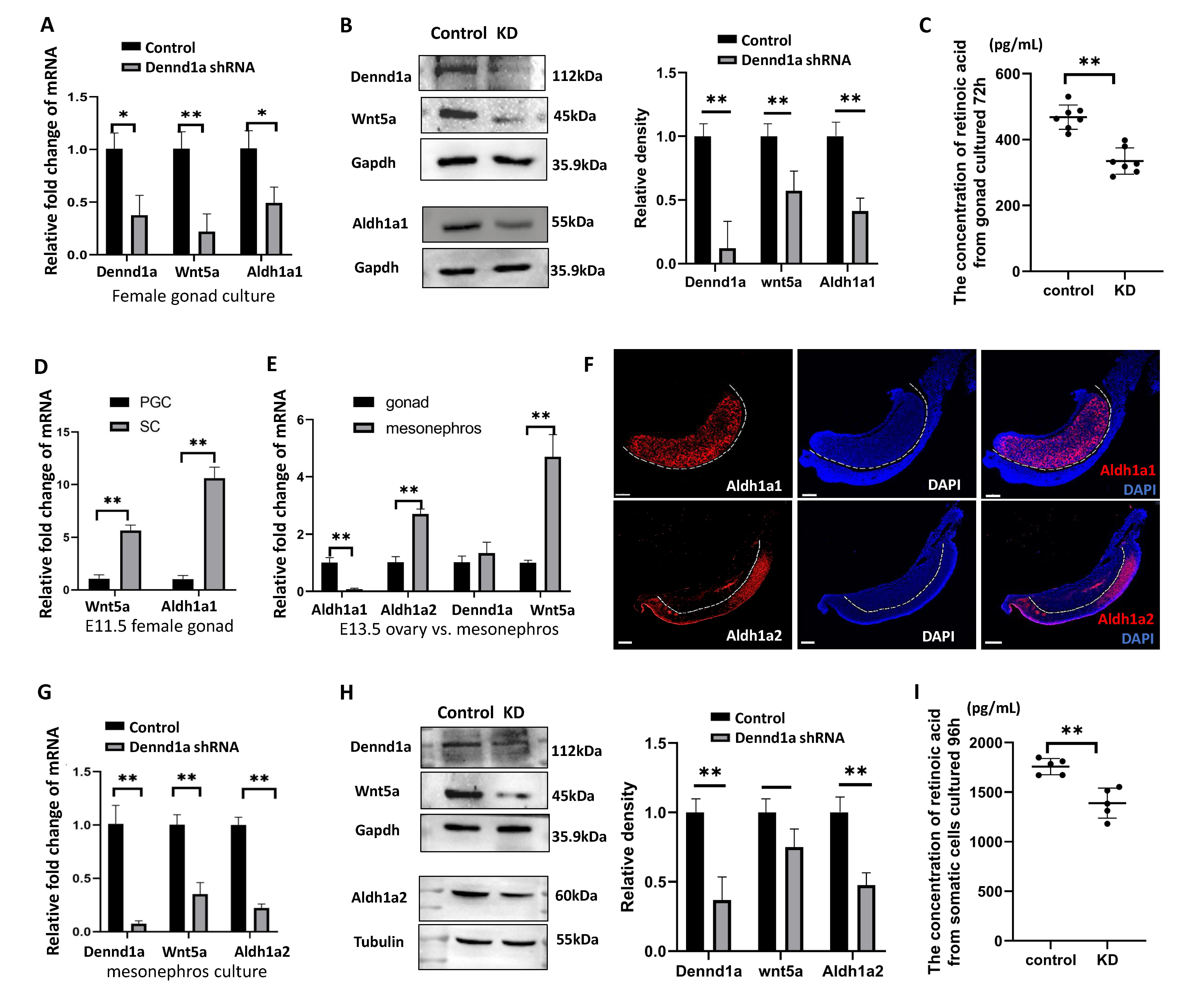 An alternative source of RA and Wnt5a is the fetal mesonephros. At E13.5, unlike the ovary which expressed mainly Aldh1a1, the mesonephros expressed RA-synthesizing enzymes Aldh1a2 (Fig. 3E,F) and Aldh1a3 [12]. The mRNA expression of Dennd1a in the mesonephros was at the same level as in the ovary, while the mesonephros expressed more Wnt5a than the ovary (Fig. 3E). The mesonephros were then isolated from E12.5 wild-type female embryos, and dissociated cells were cultured in vitro and infected with adenoviral Dennd1a shRNA for 48, 72 or 96 h (Supplementary Fig. 1). Knockdown of Dennd1a resulted in decreased mRNA and protein levels of Wnt5a and Aldh1a2 in the culture (Fig. 3G,H), and decreased production of RA in the medium (Fig. 3I). Therefore, Dennd1a may play a role in regulating the production of Wnt5a and RA from the somatic cells of the fetal ovary and mesonephros.