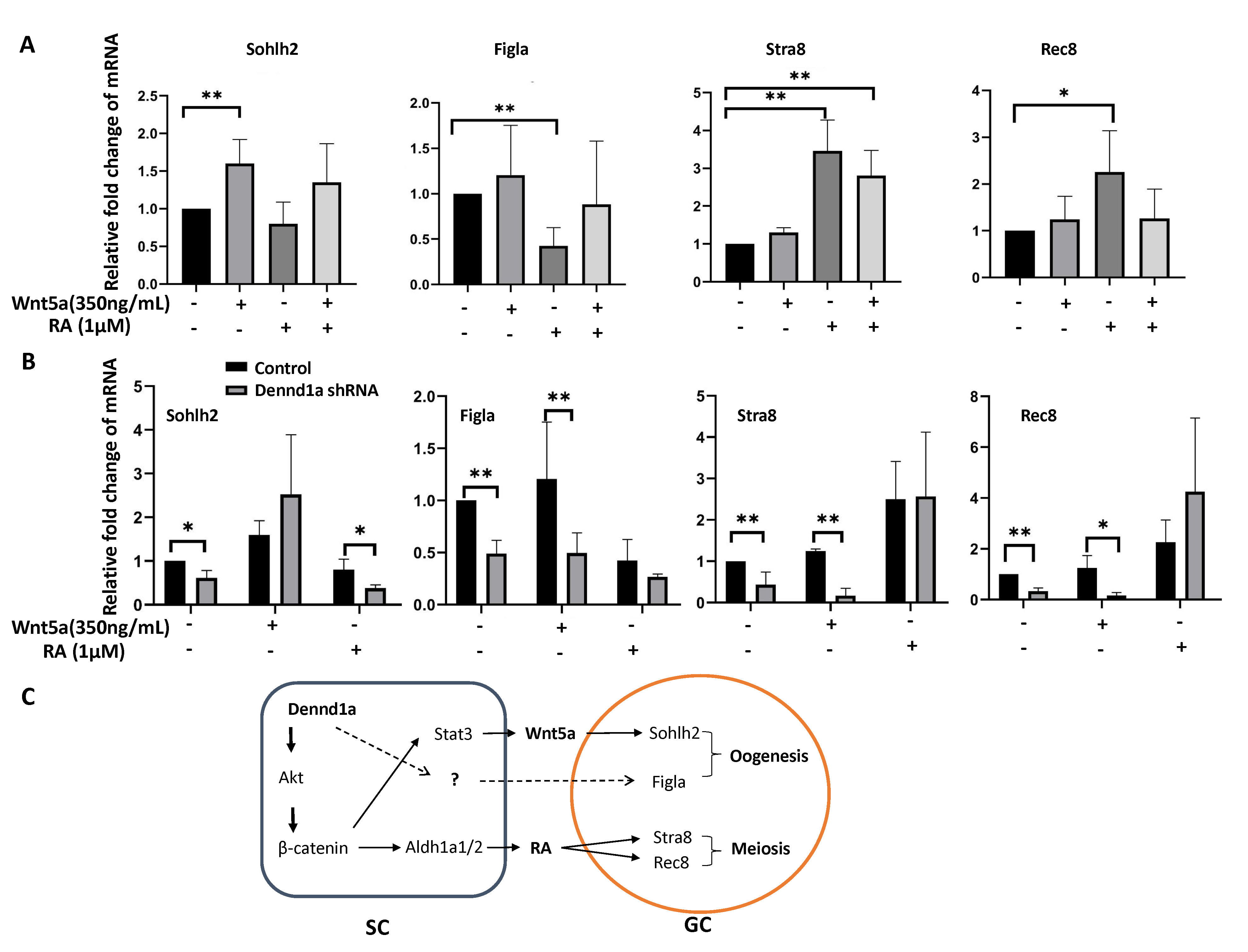 Dennd1a in the somatic cells may be involved in regulating the production of Wnt5a and RA because Dennd1a deficiency impaired the expression of both Wnt5a and genes that encoding RA-synthesizing enzymes in the fetal ovary and mesonephros. Wnt5a has been identified as an important cytokine for oocyte maturation and meiotic resumption [18]. We therefore focused our study on the effect of Wnt5a on fetal oocyte differentiation and meiosis. Wnt5a stimulated Sohlh2 during early stage of oocyte differentiation in fetal ovary, though it had no effect on the expression of Figla, Stra8 or Rec8. Moreover, the compromised activation of Sohlh2 in the fetal ovary in deficiency of Dennd1a could be rescued by exogenous Wnt5a. These findings suggest that Dennd1a in the somatic cells might stimulate Sohlh2 expression at early stage of oocyte differentiation via regulating Wnt5a synthesis. On the other hand, Dennd1a-mediated expression of Figla, Stra8 and Rec8 seems independent of Wnt5a. Although the concentrations of RA detected in the culture medium of both gonads and mesonephros by ELISA are lower than the average concentrations in the tissues of mouse embryos [26], our data is consistent with previous reports about the source of RA during germ cell development [12]. Knockdown of Dennd1a in gonad and mesonephros culture resulted in a reduced release of RA in the culture medium, suggesting Dennd1a is implicated in RA synthesis. Furthermore, RA treatment could rescue the compromised activation of Stra8 and Rec8 due to Dennd1a deficiency, indicating that meiotic initiation of the fetal germ cells depends on Dennd1a-mediated RA production. Taken together, Dennd1a could be involved in multiple signal pathways in the somatic cells that are critical for various processes and stages of oocyte differentiation and meiosis.
