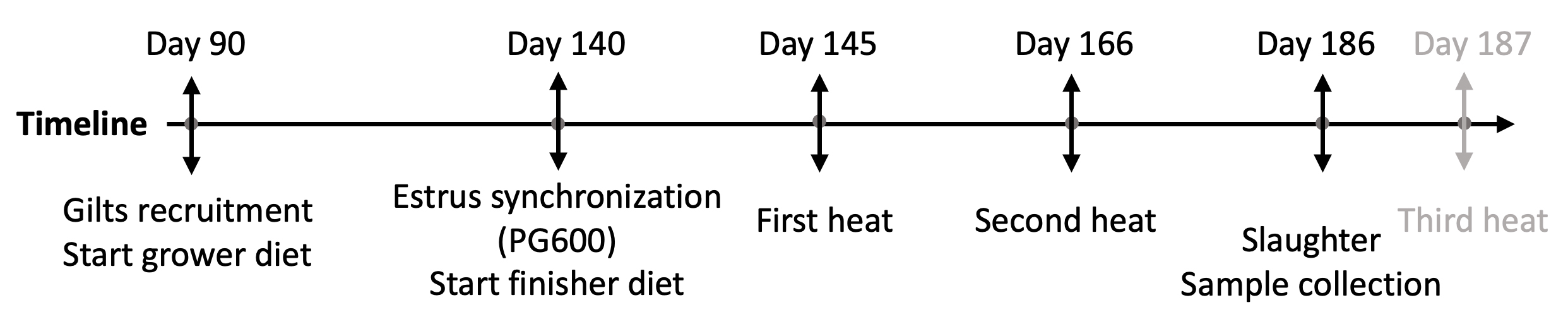 Fig. 1.Timeline of animal trial. Animals were recruited at 90 days of age and fed with experimental grower diet. At 140 days of age, PG600 was administrated for estrus cycle synchronization and feed was switched to the experimental finisher diet. At 186 days of age, one day before the expected third heat, gilts were sacrificed, and samples were collected for future analysis.