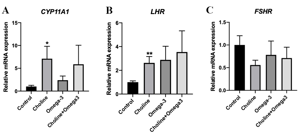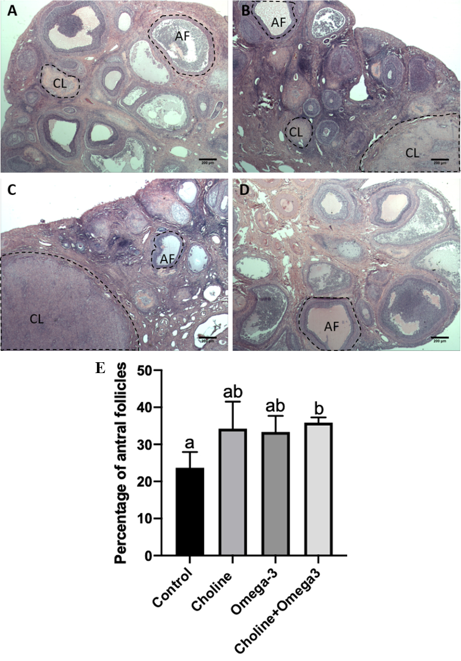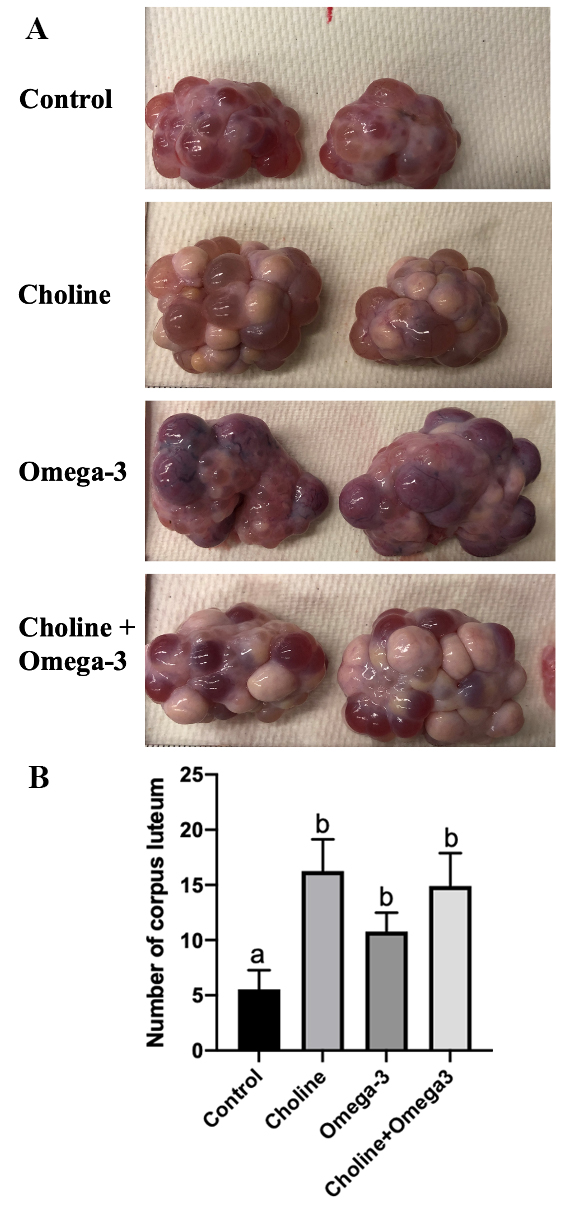 Ovarian developmental status and oocyte quality are the most important factors that affect female fertility [39]. During unassisted pregnancy in females, follicular development results in the release of oocytes from the ovary to the fallopian tube, where the oocytes can be fertilized by sperm. Moreover, ovulation rate is positively related to fecundity in various species such as sheep [40], cow [41], mice [42] and pig [43]. In this study, a higher percentage of antral follicles were found in Choline + Omega-3 supplemented group in comparison to controls, indicating that more follicles were recruited to form the antral follicle cohort. Follicle recruitment rate is positively correlated with reproductive ability and the oocyte quality in humans [44]. Furthermore, both Choline and Omega-3 groups had a significantly increased number of corpus luteum per ovary in comparison to the control, meaning more follicles had ovulated. Choline is also a substrate for the synthesis of betaine via choline dehydrogenase during oocyte in vitro maturation, and this betaine accumulation is reported to be required for oocyte meiotic maturation [45]. Taken together, this suggests that choline and/or Omega-3 supplementation promotes and enhances ovulation for successful fertilization and implantation. Additionally, choline is an essential component in forming phosphatidylcholines, a class of phospholipids that are a major element in forming the cellular membrane. Phosphatidylcholines accumulate during follicle growth, and their depletion significantly affects follicular development and antrum formation [46]. Thus, choline supplementation may have contributed to oocyte maturation and ovulation by providing additional substrate for the synthesis of these biomolecules.