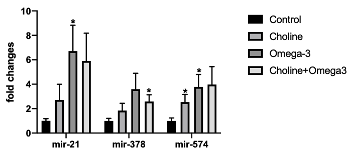 expression was significantly higher in the Choline + Omega-3 group, and miR-574