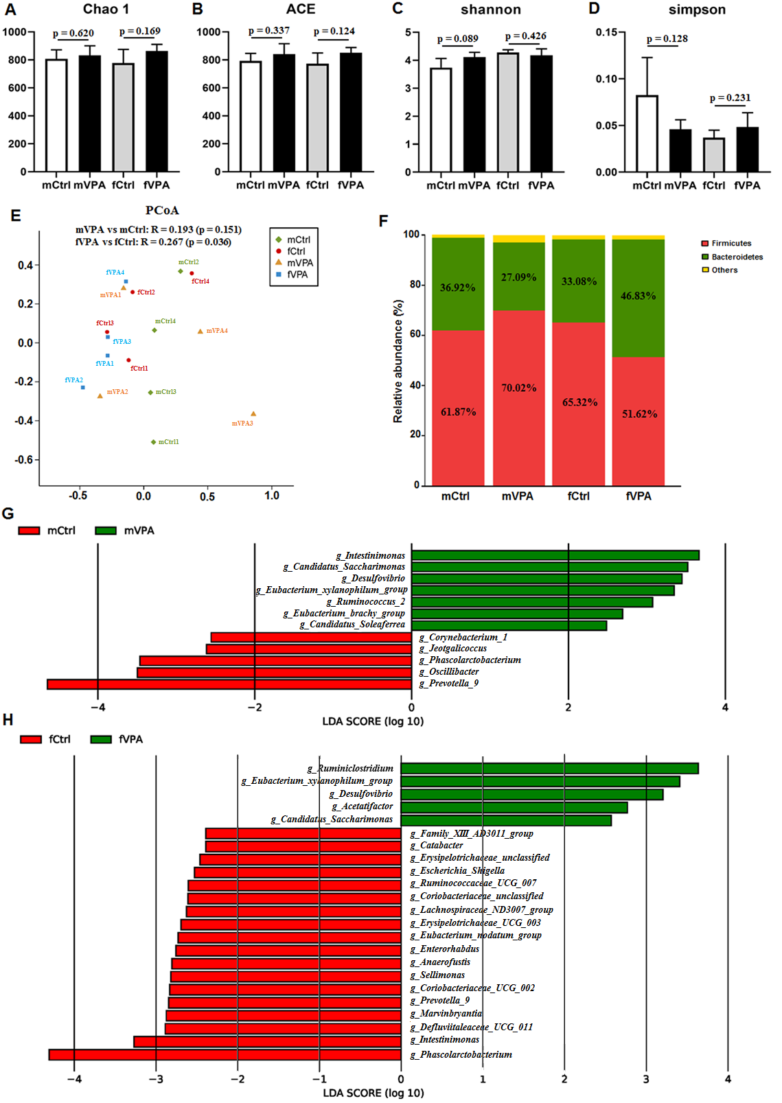 Fig. 1.The difference in gut microbiota in different sexes between the Ctrl and VPA rats. (A) Chao1 index. (B) ACE index. (C) Shannon index. (D) Simpson index. (E) PCoA chart. The X and Y axes represent two selected principal axes. The percentage represents the explanatory value of the principal axis for the difference between samples. (F) Column chart of species composition at the phylum level. (G–H) LDA chart. The impact of the representative species abundance on the differences between (G) the mVPA and mCtrl groups or between (H) the fVPA and fCtrl groups. mCtrl, male control group; mVPA, male VPA group; fCtrl, female control group; fVPA, female VPA group.