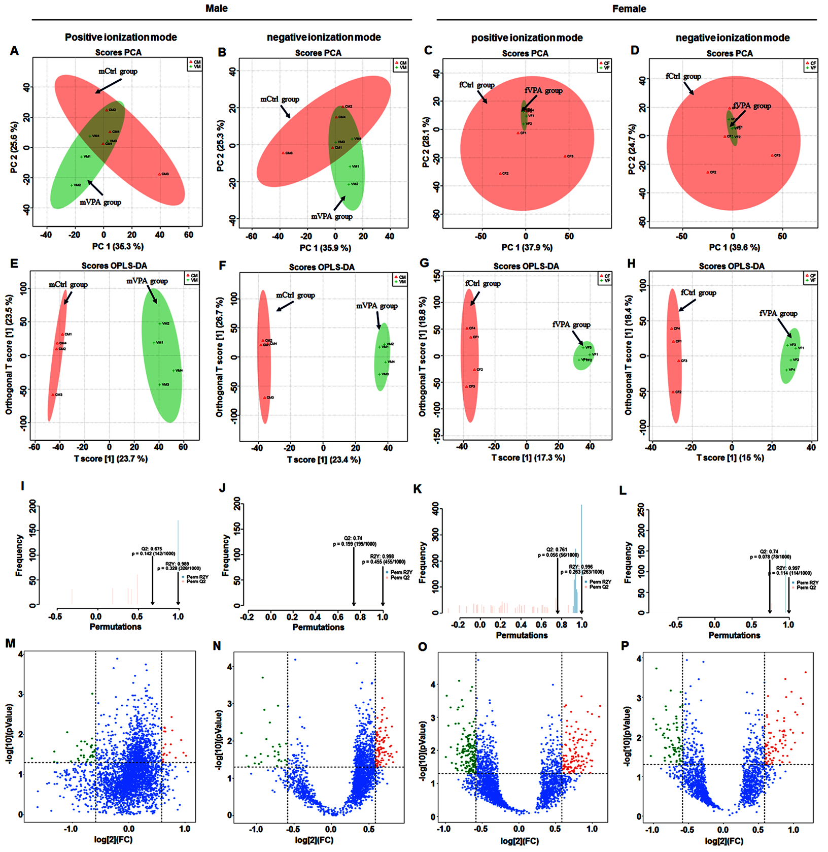 Fig. 2.The difference in fecal metabolites in different sexes between the Ctrl and VPA rats. (A–D) Principal component analysis (PCA). (E–H) Orthogonal partial least squares discrimination analysis (OPLS-DA). (I–L) OPLS-DA model validation. (M–P) Volcano map of differentially abundant metabolites. mCtrl, male control group; mVPA, male VPA group; fCtrl, female control group; fVPA, female VPA group.