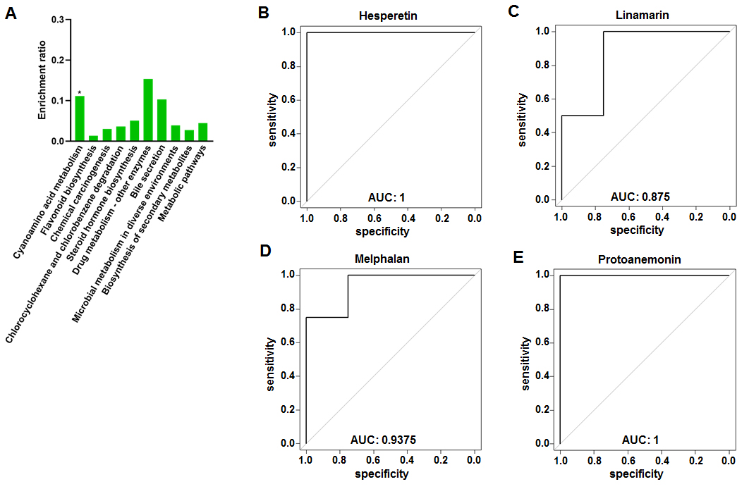Fig. 3.KEGG analysis of fecal metabolites in male VPA rats. (A) KEGG pathway enrichment column chart in male VPA rats. The abscissa is the name of KEGG pathway. (B–E) Receiver operator characteristic curves of the four characteristic fecal metabolites. (B) Hesperetin. (C) Linamarin. (D) Melphalan. (E) Protoanemonin.
