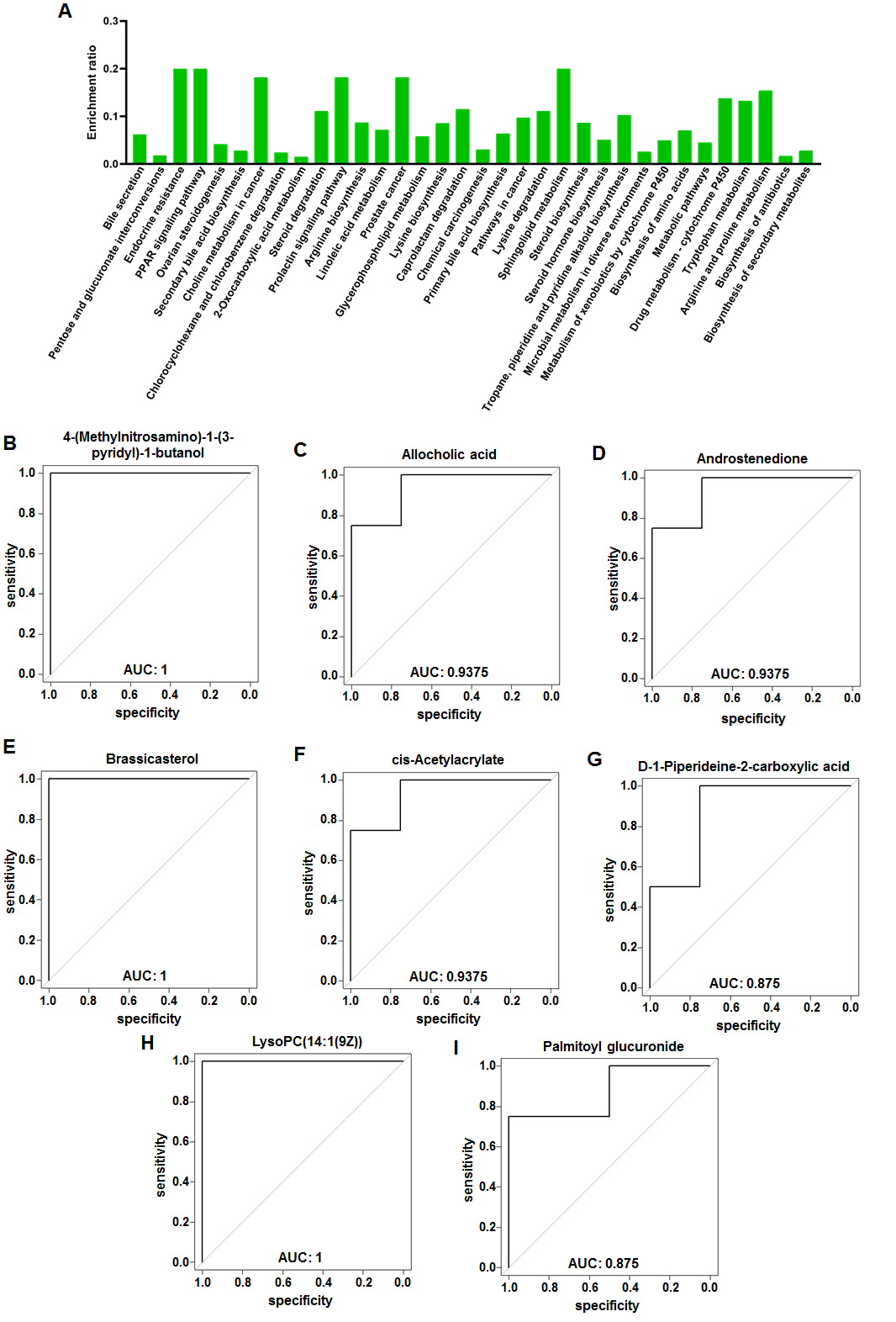 Fig. 4.KEGG analysis of fecal metabolites in female VPA rats. (A) KEGG pathway enrichment column chart in female VPA rats. The abscissa is the name of KEGG pathway. (B–I) Receiver operator characteristic curves of the eight characteristic fecal metabolites. (B) 4-(Methylnitrosamino)-1-(3-pyridyl)-1-butanol. (C) Allocholic acid. (D) Androstenedione. (E) Brassicasterol. (F) cis-Acetylacrylate. (G) D-1-Piperideine-2-carboxylic acid. (H) LysoPC(14:1(9Z)). (I) Palmitoyl glucuronide.
