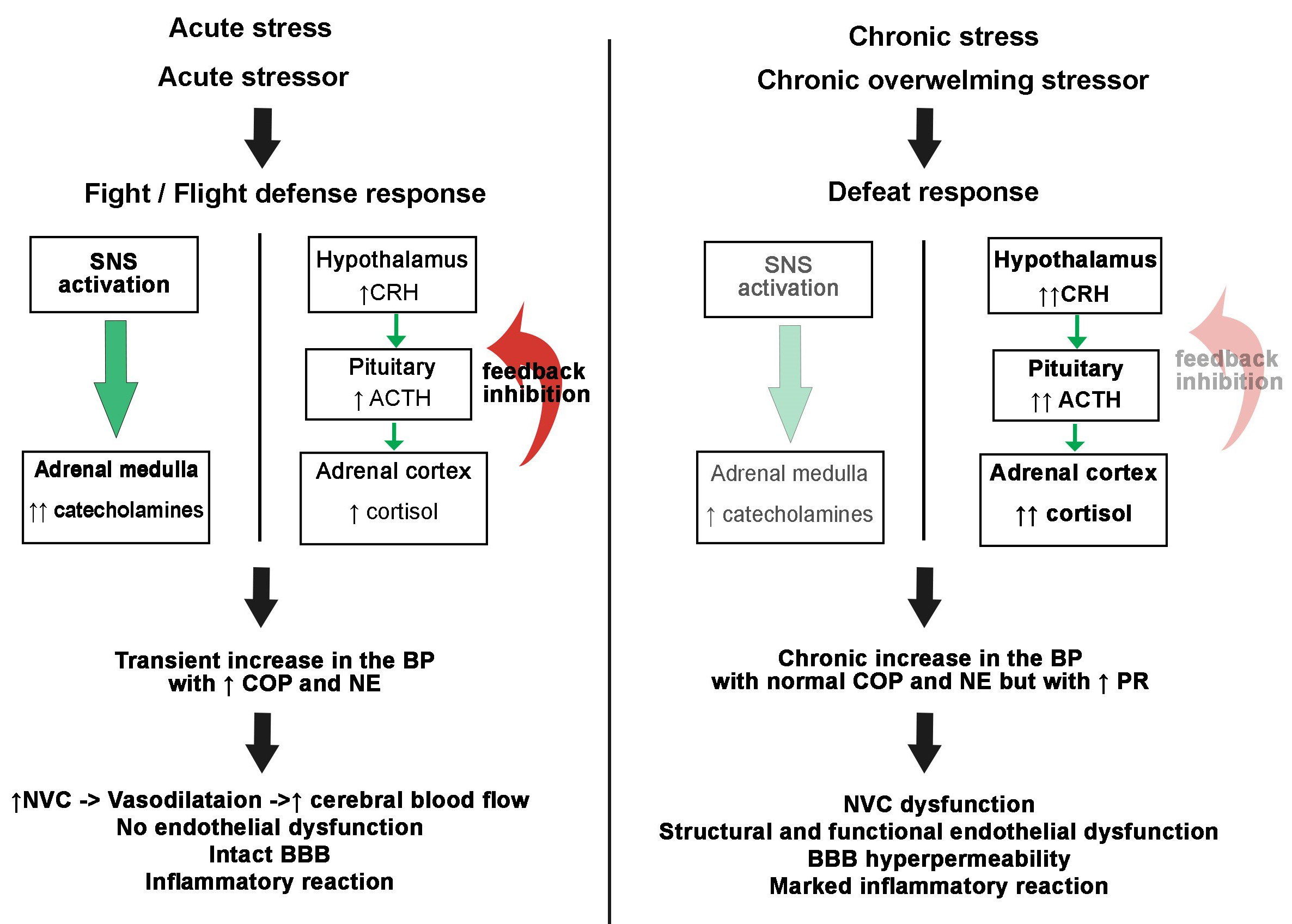 Fig. 1.Acute and chronic hormonal response to stress. SNS, sympathetic nervous system; CRH, corticotropin releasing hormone; ACTH, adrenocorticotropic hormone; BP, blood pressure; COP, cardiac output; NE, norepinephrine; NVC, neurovascular coupling; BBB, blood brain barrier; PR, peripheral resistance.