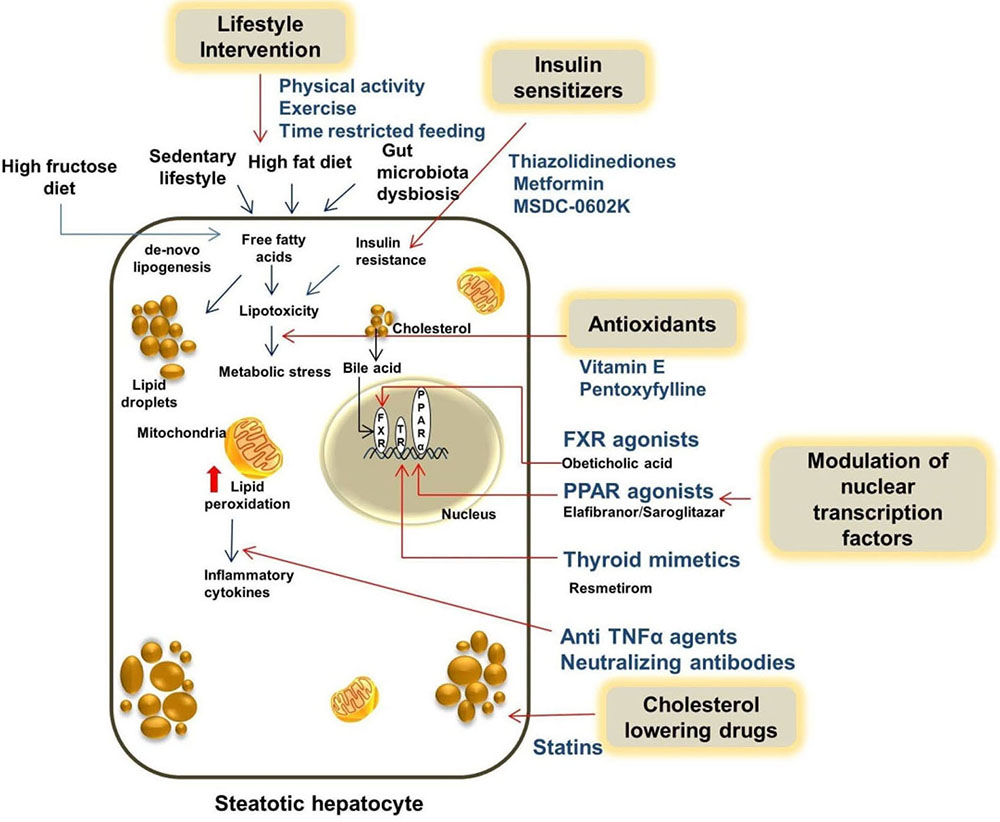 Insulin resistance is a major driving force for excessive fat accumulation in the liver and plays a key role in the initiation and progression of steatohepatitis and fibrosis. Several pharmacological agents listed below are focused to improve insulin resistance.