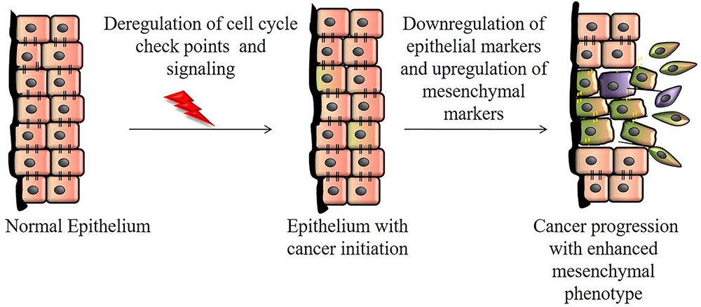 Figure 1Tumor progression with increase in EMTTFs. Deregulation in the cell cycle check points and signaling pathways that regulate proliferation/differentiation in the cells of the normal epithelium leads to tumor initiation. These initiated cells proliferate uncontrollably and then undergo EMT transition where they lose their epithelial phenotype and attain mesenchymal phenotype with increase in EMT-TFs such as SNAIL, SLUG, TWIST1/2 and ZEB1/2. (EMT: Epithelial to mesenchymal transition; TF’s: Transcription factors).