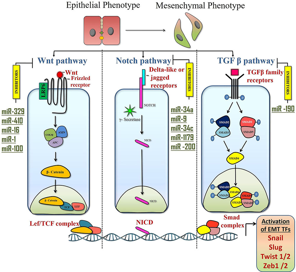 Figure 3Signaling pathways that activate EMT and their regulation by miRs. Multiple cell-intrinsic signaling pathways cooperate to induce the expression of EMT TFs such as ZEB, SNAIL, SLUG and TWIST that induce the transition to the epithelial cell state to mesenchymal cell state. Canonical WNT pathway is activated upon binding of canonical WNT ligands to the Frizzled family of membrane receptors. This leads to the release of β- catenin from the destruction complex. β- Catenin then translocate to the nucleus, where it binds to the transcription factors TCF (T cell factor) and LEF (lymphoid enhancer- binding factor) to activate genes that drive EMT. Micro RNAs such as miR-329, miR-16 and miR-410 down regulate WNT signaling thereby regulating EMT in HNSCC whereas miR-1 and miR-100 target Wnt signaling to inhibit EMT in breast cancer. The Notch pathway is activated upon binding of the Delta-like or Jagged family of ligands to the Notch receptor. This binding activates γ-secretase which cleaves Notch to form NICD, which enters the nucleus to function as a transcriptional co-activator.miR34a, miR-1179, miR-200, miR- 9 and miR-34c are some of the miRs that target Notch to inhibit breast cancer invasiveness. Binding of the TGF-β proteins to the TGF-β family of receptors leads to receptor phosphorylation and activation of SMAD 2/3 or 1/5 which forms complexes with Smad4 and enters into the nucleus and then activates the EMT program. miR190 targets TGF-β signaling and inhibits breast cancer metastasis. EMT: Epithelial to mesenchymal transition; TF’s: Transcription factors; CTC: Circulating tumor cells; CSCs: cancer stem cells; miRs: microRNA; HNSCC: Head and neck squamous cell carcinoma.