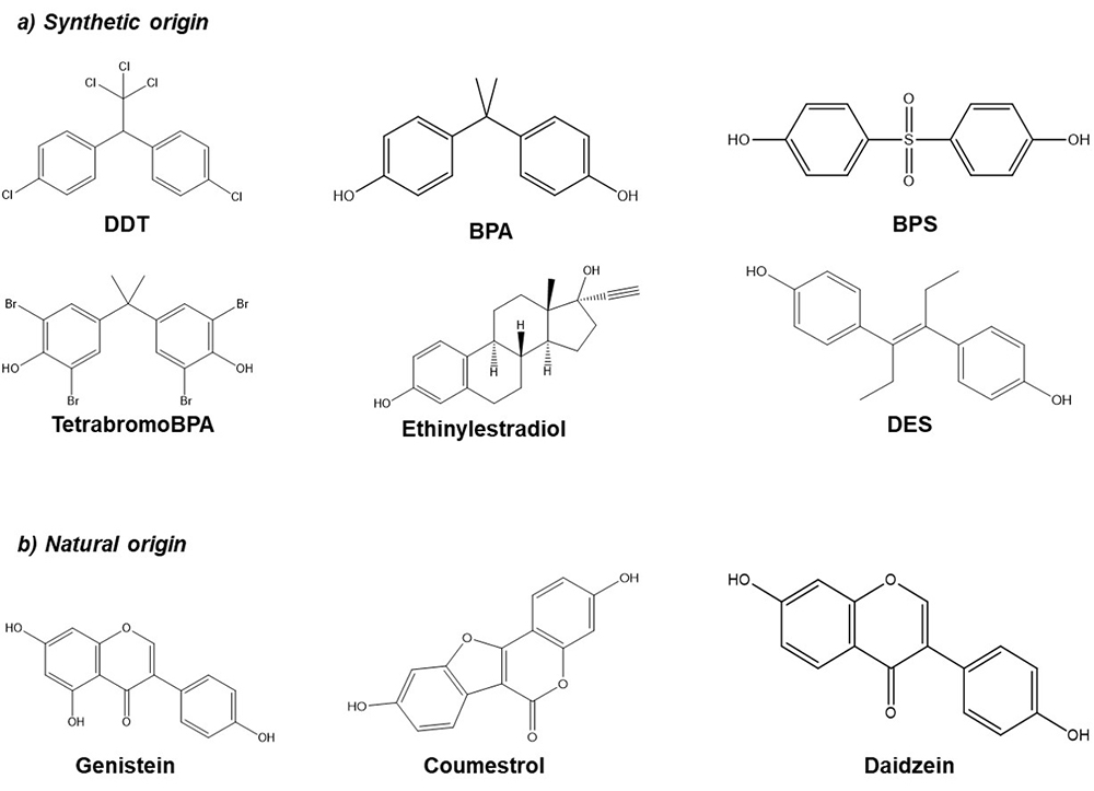 Figure 1Chemical structure of several EDCs. a) Synthetic origin; Dichloro-Diphenyl-Trichloroethane (DDT), Bisphenol A (BPA), Bisphenol S (BPS), Tetrabromo Bisphenol A (TetrabromoBPA), Ethinylestradiol, Diethylstilbestrol (DES). b) Natural origin; Genistein, Coumestrol, Daidzein.