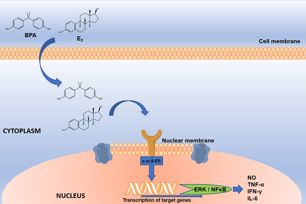 Figure 2Schematic representation of E2 and BPA interaction with nuclear ERs. E2 or BPA interacts with nuclear ERs. BPA; Bisphenol A, E2; Estradiol; ERα or β; Estrogen receptor alpha or beta. The interaction between BPA and ER will activate genes such as ERK and NFκB, which will generate the production of proinflammatory cytokines and nitric oxide. BPA; Bisphenol A, E2; Estradiol, ER; Estrogen Receptor, ERK; extracellular signal-regulated kinases; NFκB; nuclear factor kappa-light-chain-enhancer of activated B cells, NO; Nitric Oxide.