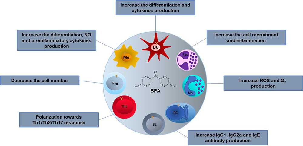 B lymphocytes (BL) are cells whose importance lies in humoral immunity, since they are able to differentiate into plasmatic cells (PCs), which are responsible for the production of antibodies such as IgA, IgG, IgE, IgD and IgM. In different studies, it has been observed that BPA may modify in a different way the production of antibodies by these cells. Yoshino et al., (2003) using male and female DBA / 1J adult mice, report that BPA generates an increase in the proliferation of splenocytes, in addition to an increase in the production of antibodies in a dose-dependent manner (51). Similarly, in another study, it was reported that gestational exposure to BPA generated increased production of IgG1 and IgG2a antibodies, with predominance of IgG2a antibodies in male offspring (52).