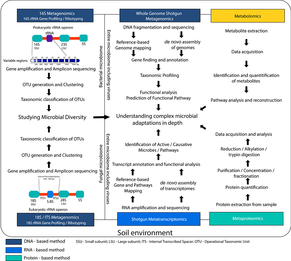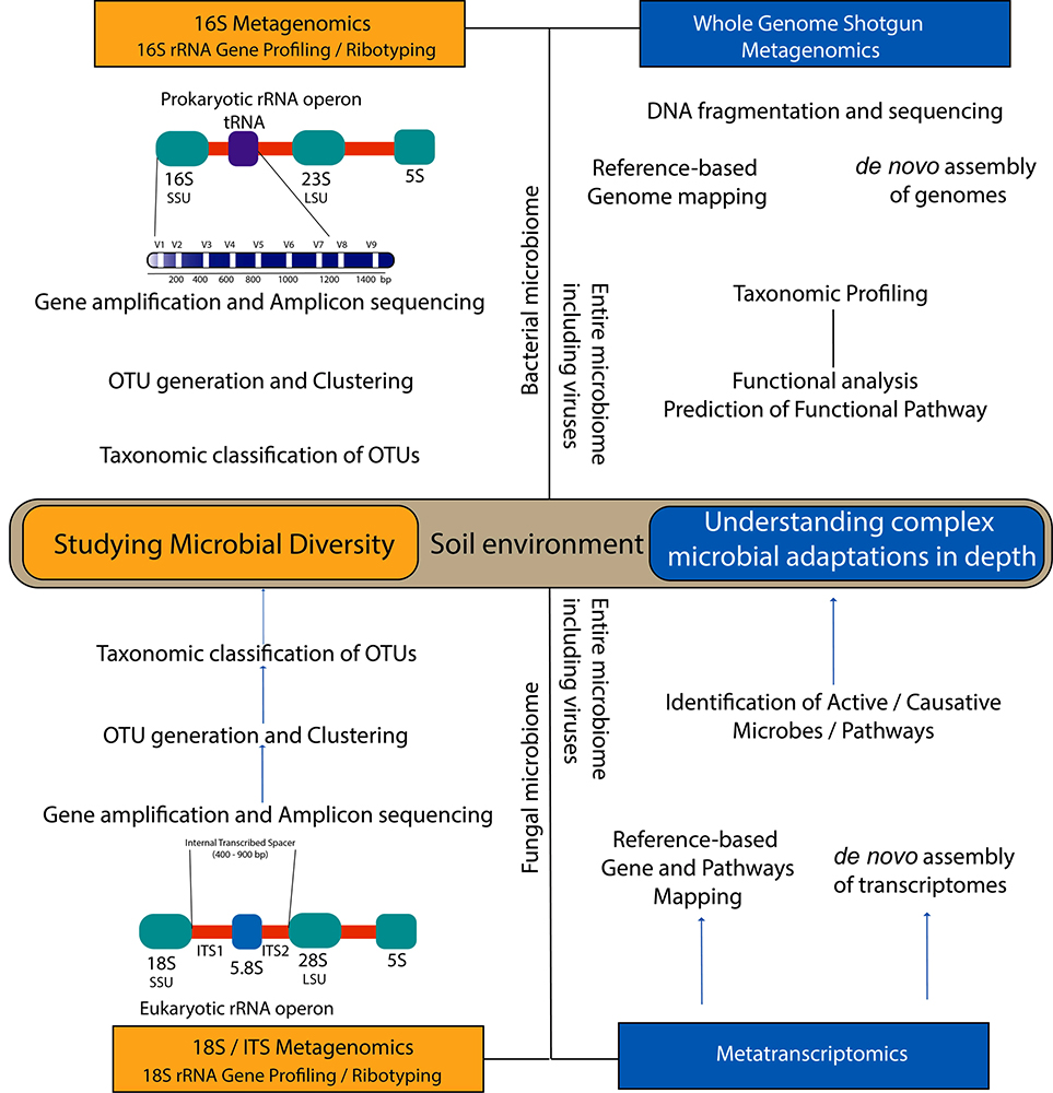 In exploring the soil microbiome, traditional microbiological methods come with several limitations and fall short particularly with non-cultivable microorganisms that make up the vast majority of the microflora. Several reports have shown the use of Next Generation Sequencing (NGS) techniques that have addressed such limitations through metagenomic approaches (8–11). NGS methods have greatly impacted microbiomics and in due course of time, sequencing technologies have evolved dramatically. With the advent of new techniques in NGS and analysis techniques and the rapidly declining costs, NGS has emerged as a gold standard in ascertaining the presence and role of key regulators in soil productivity (12). With emerging advanced methods such as Metatranscriptomics, Metaproteomics and Metabolomics, Soil microbiome analysis provides an approach to study regulation of the soil’s nutrient cycle by way of which sustainability in soil could be achieved (13). fig1 depicts the process and applications involved in metagenomics.