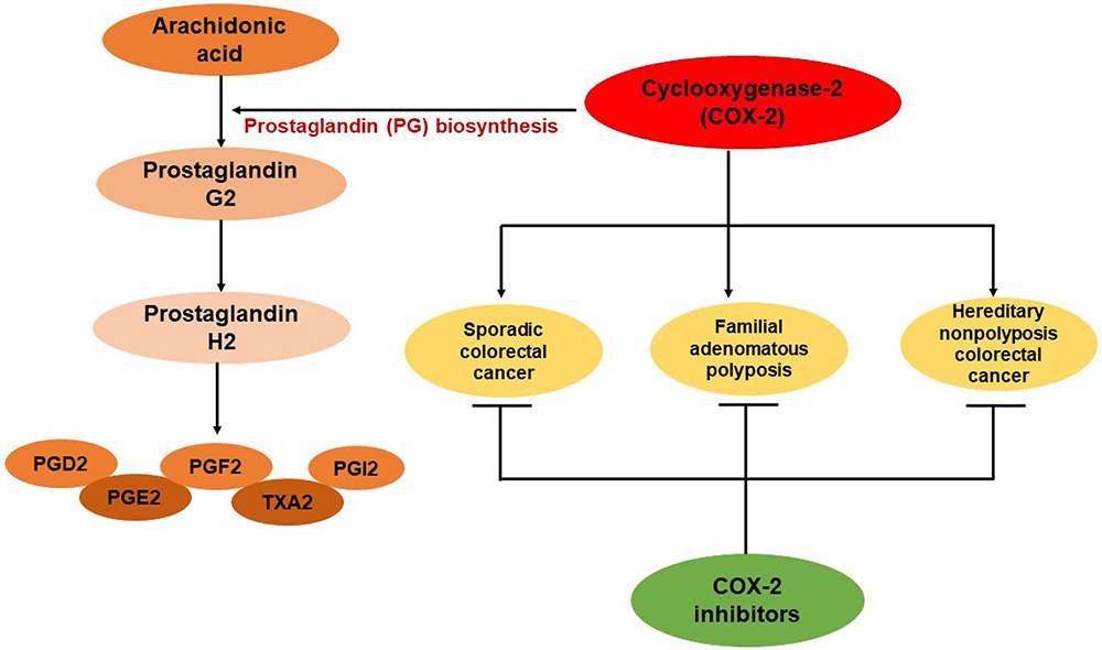 It is well known that COX-2 is a proinflammatory molecule and highly expressed in inflammatory diseases. The main function of this enzyme is to mediate prostaglandin biosynthesis and convert arachidonic acid to prostaglandins, which are overexpressed during inflammation and may cause gastrointestinal diseases. COX-2 is one of the key molecules which involved in the progression of sporadic and familial colorectal cancer and the use of COX-2 inhibitors open up a new vista for the colorectal cancer treatment.