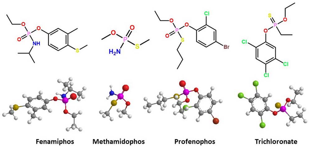 Figure 1Three-dimensional representation of the docked complex of chiral structure of organophosphorus pesticides; *denotes chiral center.