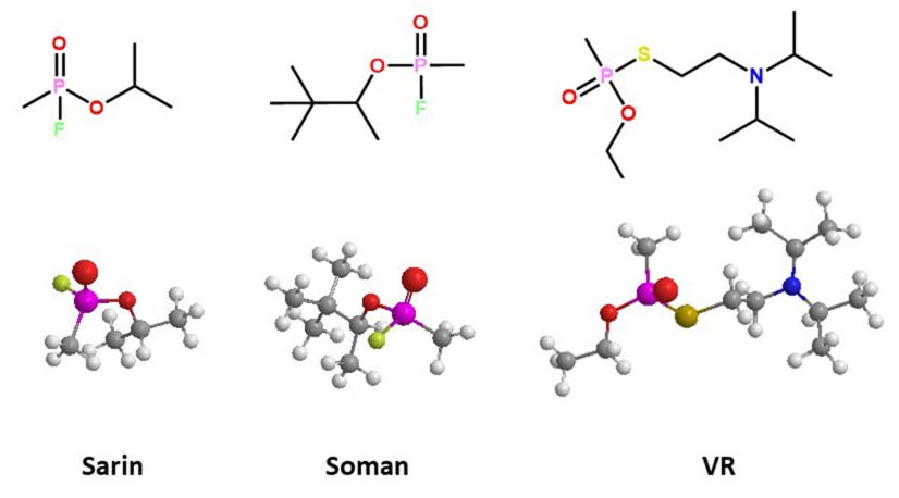 Figure 2Three-dimensional representation of the docked complex of chemical structure of toxic OP nerve agents; *denotes chiral center.