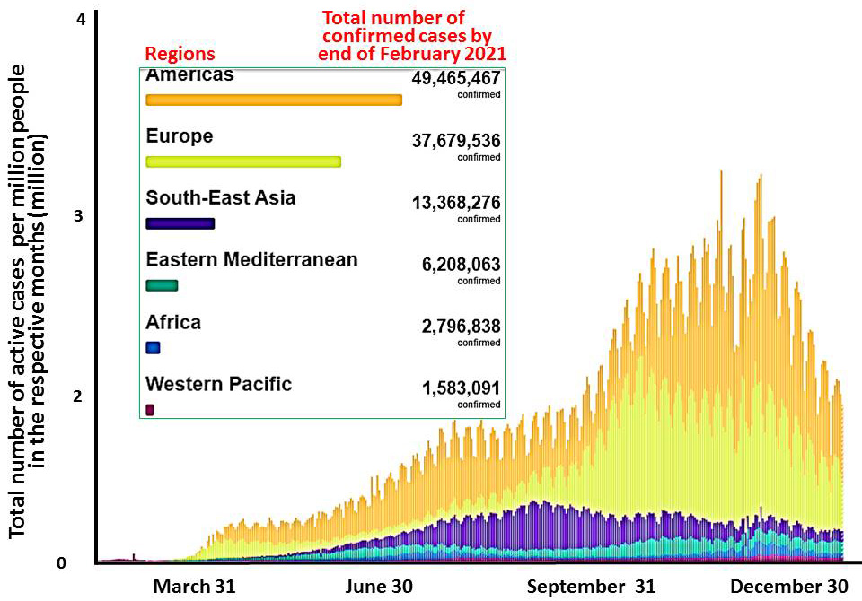 Fig. 1.Global status of COVID-19 outbreak by the end of 2020. As per the latest data obtained from the world health organisation (https://covid19.who.int/) zonation up to the end of the year 2020, the total numbers of confirmed COVID-19 cases per million people are found to be higher in American countries followed by the European and Asian countries (total number indicated as insert).
