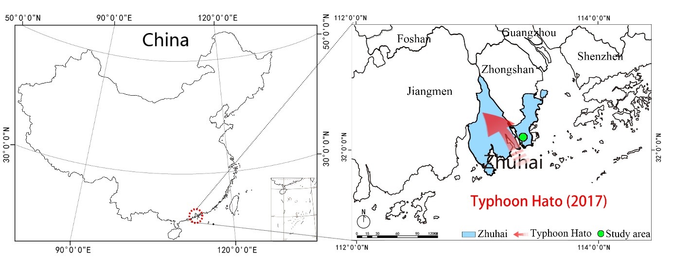 Fig. 1.Schematic of Zhuhai in China (blue area with red framework), landing location and route of Typhoon Hato (broad red arrow), and location of our study area in Zhuhai (green area).