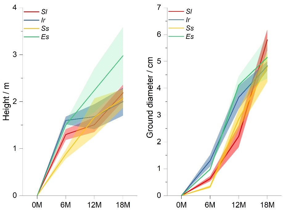 Fig. 2.Development of tree height (m) and ground diameter (cm) of Sl (red line), Ir (blue line), Ss (orange line), and Es (green line) from June 2018 (0 months, 0M) to December 2019 (18 months, 18M), around which the light red, blue, orange, and green shading areas are the 95% confidence intervals, respectively.