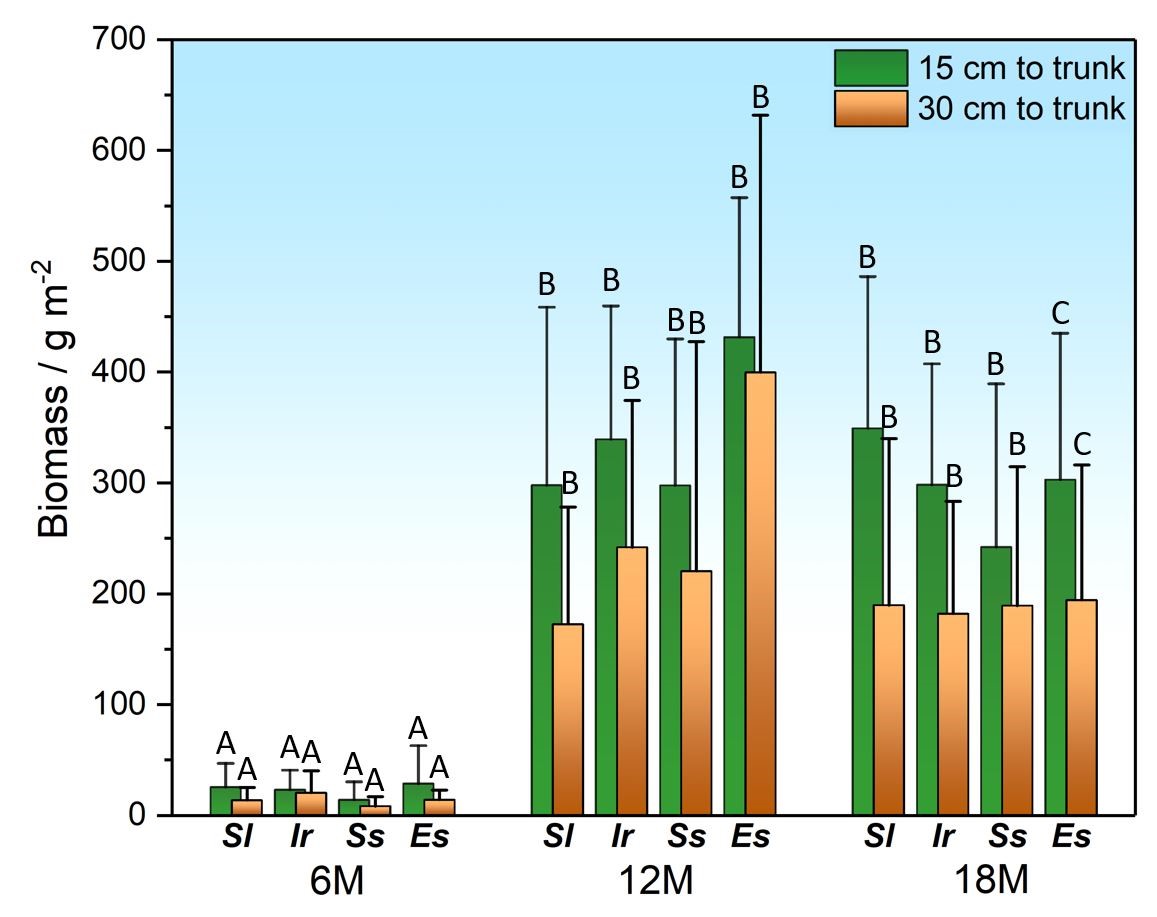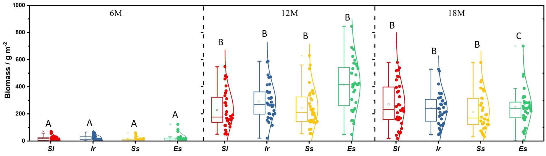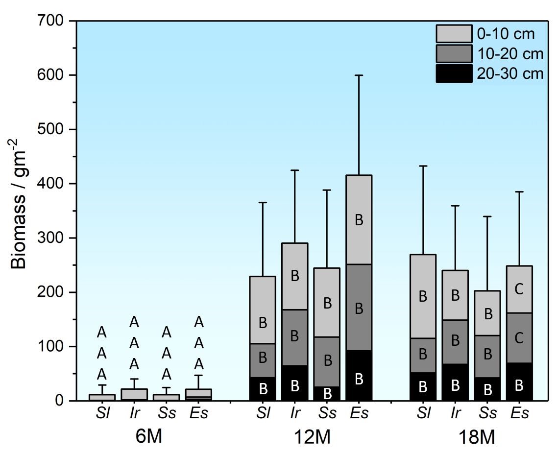 For the above-ground process, Es had advantageous growth with the highest value of tree height and second-highest value of ground diameter. The other three tree species exhibited inclinations to develop ground diameter than height, which were probably more wind-resistant from the morphological perspective. For the below-ground process, Sl was the only tree species that obtained continuous development, while Ir, Ss, and Es decreased from 12M to 18M. Besides, Sl, Ir, and Ss maintained their investment in deep roots when Es had significant deep root biomass reduction. In the horizontal level, Ss had the highest proportion of outmost roots among the four tree species.