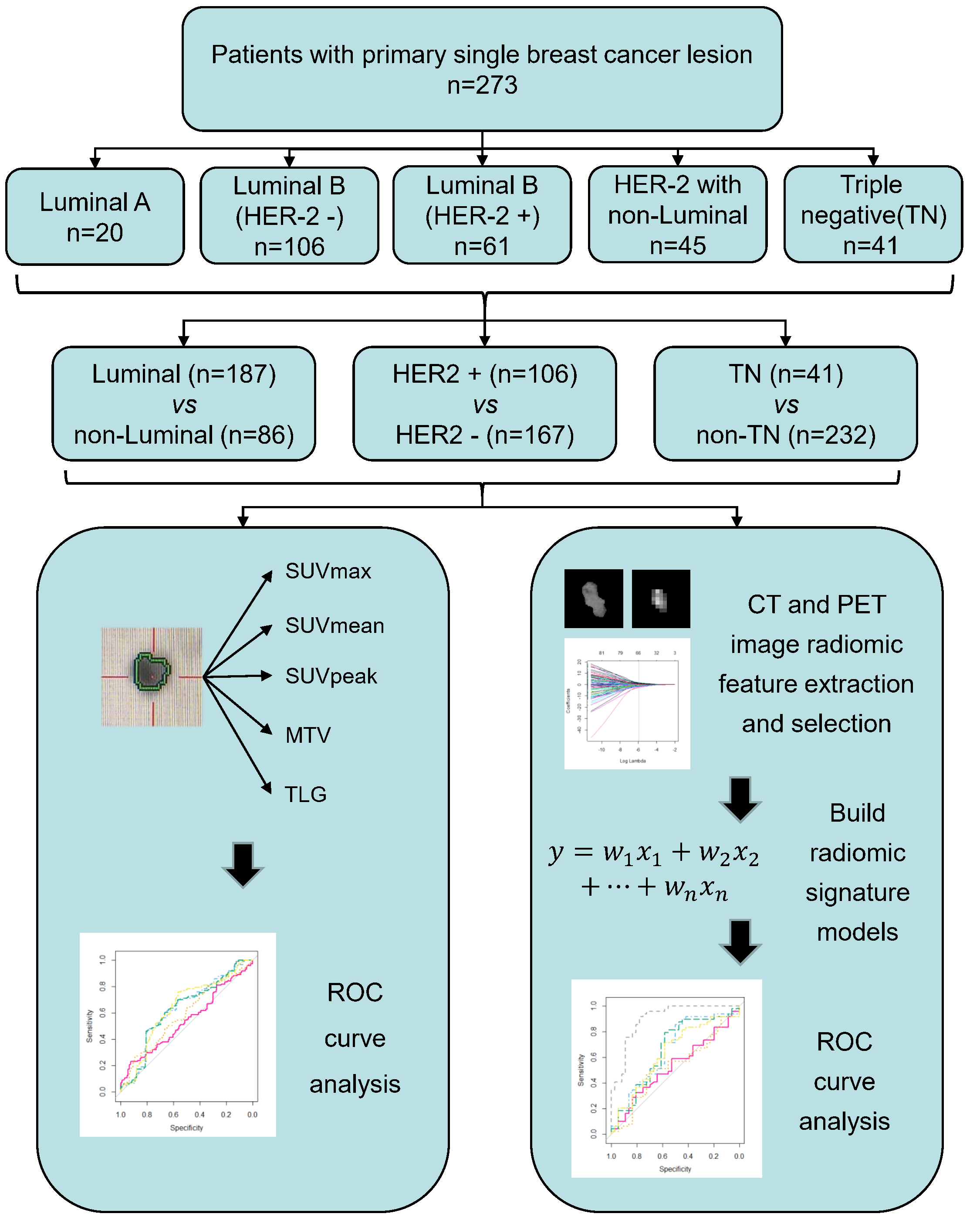 Fig. 1.The workflow of this study. Briefly, a total of 273 eligible BC patients were enrolled in the radiomic analysis. Based on the molecular subtypes classification by IHC or FISH assay, BC patients were divided into different groups for comparison, including Luminal vs. Non-luminal, HER2+ vs. HER2– and TN vs. Non-TN. Radiomic analysis in the study mainly consist of lesion segmentation, radiomic features extraction and selection, multivariate radiomic signature model construction, and evaluation of the predictive performance of the developed radiomic signature model in molecular subtypes classification of BC by ROC analysis. Apart from radiomic analysis, a total of 5 conventional PET parameters (SUVmax, SUVmean, SUVpeak, MTV and TLG) were also calculated to compare their abilities to discriminate between different molecular subytypes of BC with that of established radiomic signature model. BC, breast cancer; CT, computed tomography; FISH, fluorescence in situ hybridization; HER2, human epidermal growth factor receptor 2; IHC, immunohistochemistry; MTV, metabolic tumor volume; PET, positron emission tomography; ROC, receiver operating curve; SUV, standardized uptake value; TLG, total lesion glycolysis; TN, non-triple.
