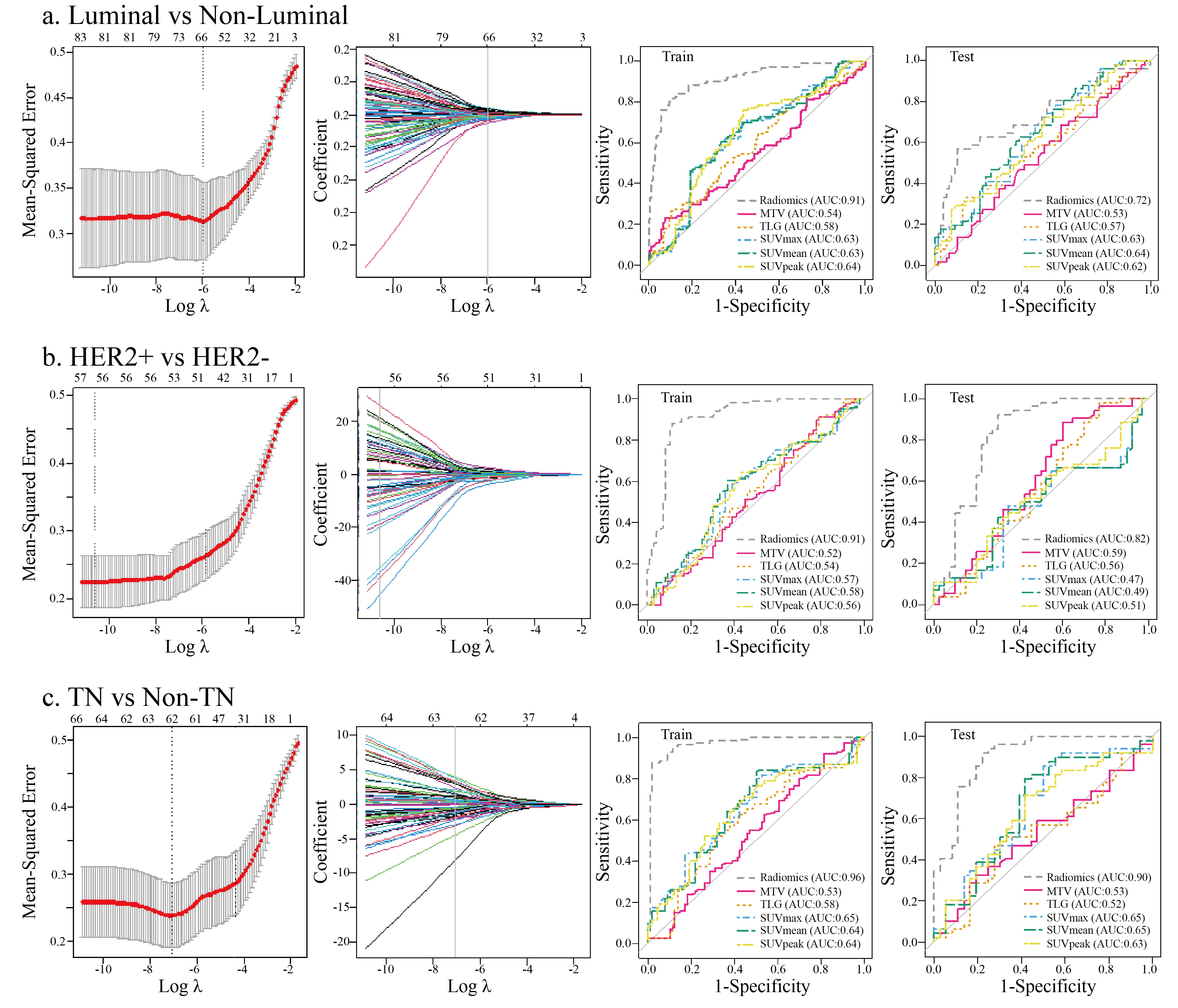 A total of 1710 radiomic features (855 PET-based and 855 CT-based radiomic features) were extracted and computed based on PET/CT images. After LASSO regression (Fig. 2), the most predictive radiomic features based on PET/CT images were selected to establish radiomic signature models for molecular subtype classification of BC. As presented in Supplementary Fig. 1, three most predictive sets of radiomic features were included in each established multivariate radiomic signature models, including Luminal vs. Non-Luminal (Supplementary Fig. 1A), HER+ vs. HER2– (Supplementary Fig. 1B) and TN vs. Non-TN (Supplementary Fig. 1C). In addition, the formulas to compute the radiomics score (Rad-score) for each patient through a linear combination of selected features weighted by their respective coefficients in each established multivariate radiomic signature models were also listed in the Supplementary materials. To evaluate the performance of established radomic signature models in distinguishing molecular subtypes of BC, ROC analyses were conducted and AUCs were used as the main outcomes. As shown in Fig. 2, all the three established multivariate radiomic signature models significantly outperformed all the conventional PET parameters (SUVmax, SUVmean, SUVpeak, MTV and TLG) in molecular subtype classification of BC, with a AUC of 0.913 and 0.725, 0.912 and 0.820, 0.968 and 0.901 for Luminal vs. non-Luminal (Fig. 2a), HER+ vs. HER2– (Fig. 2b) and TN vs. non-TN (Fig. 2c) discrimination in the training set and the validation set, respectively. In consideration of a significant association between SUV parameters and molecular subtype classification of BC, several integrated models by taking into account not only PET/CT derived radiomic features but also SUV parameters were established to assess their performance in molecular subtype classification of BC. A comparable but not a superior performance of integrated models in molecular subtype classification compared to radiomic signature models was observed.
