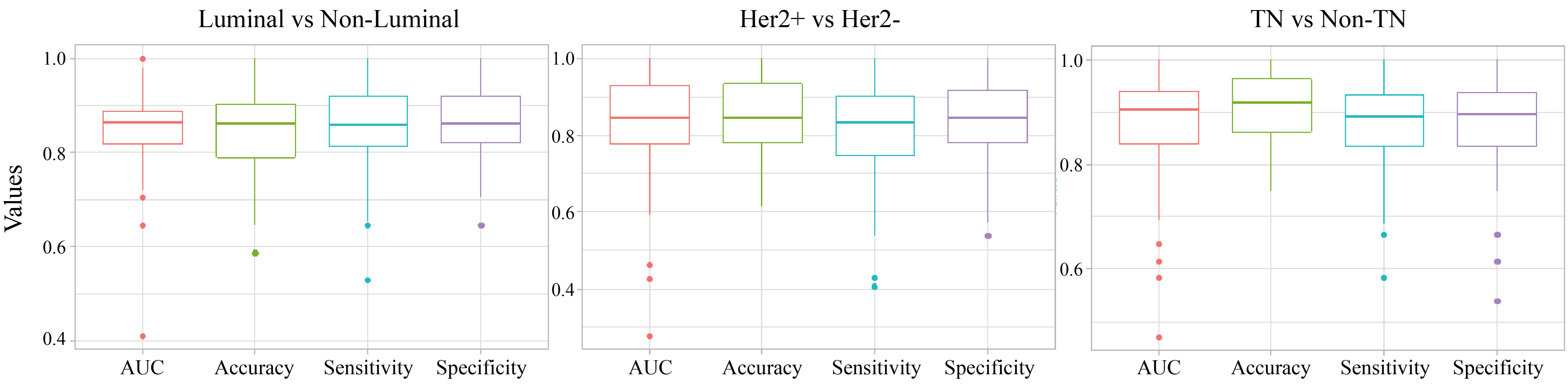 Fig. 3.The distribution of AUC, accuracy, sensitivity and specificity of the established radiomic signature models in molecular subtypes classification of BC in the 10-fold cross validation. The thick lines represent the median of performance indicators. The median AUC, accuracy, sensitivity and specificity were used to describe the predictive power of each established radiomic models in each molecular subtype classification of BC, including including Luminal vs. Non-Luminal (left), HER2 + vs. HER2 - (middle), TN vs. Non-TN (right).