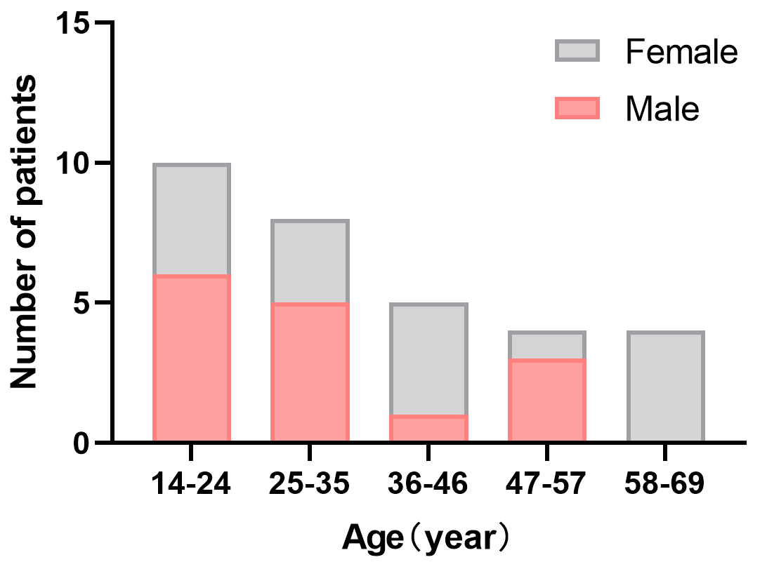 Fig. 1.Age/sex distribution of patients. The onset median age was 31 (range 14–68) years. Sixteen (51.6%) patients were females.