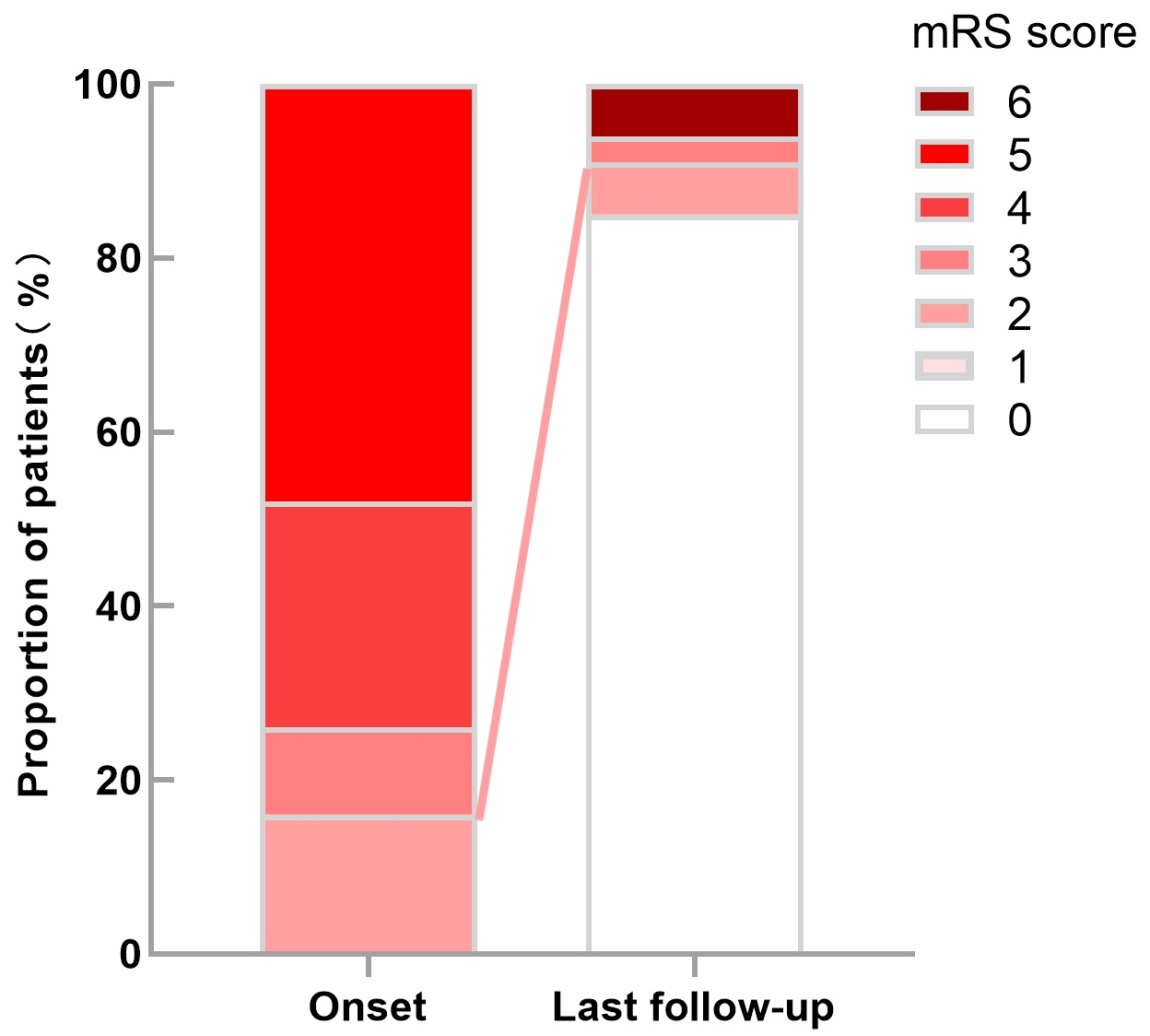 Fig. 2.The scores of mRS distribution at admission and last follow-up.