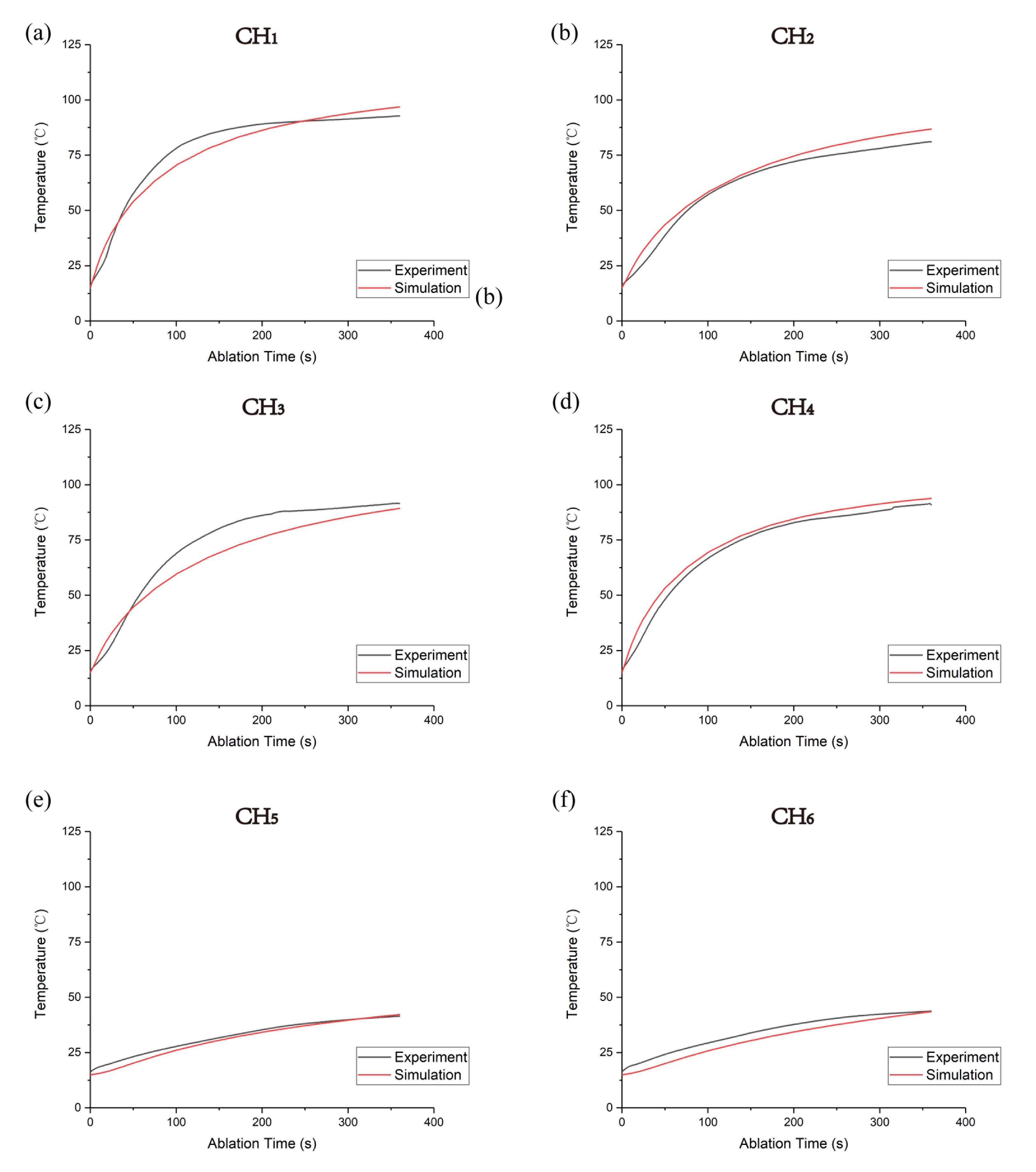 Fig. 5.Comparisons between thermal ablation data and simulation results at (a) the measurement point CH1, (b) the measurement point CH2, (c) the measurement point CH3, (d) the measurement point CH4, (e) the measurement point CH5, (f) the measurement point CH6.