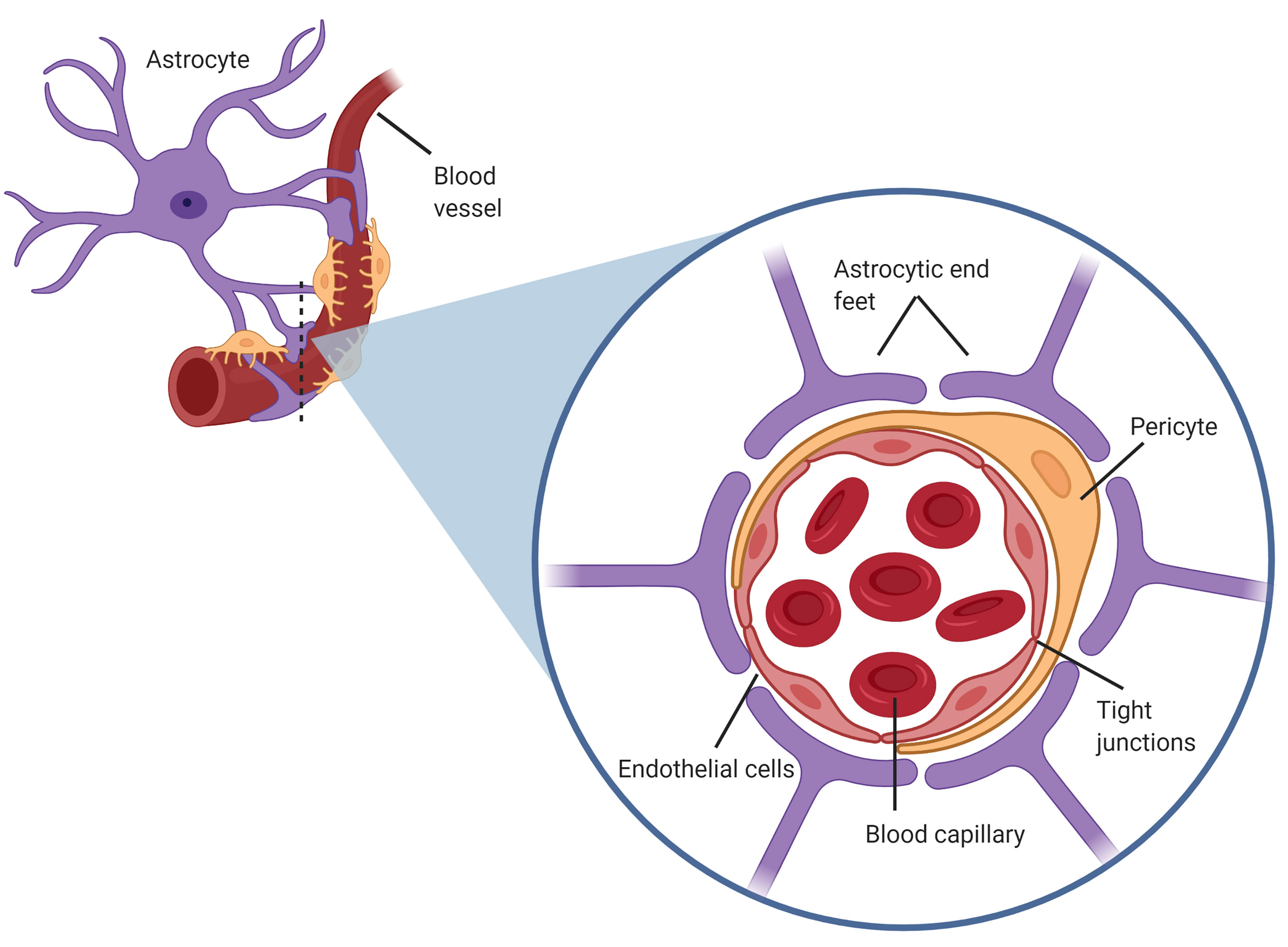 Fig. 1.Structure of the blood brain barrier (BBB), also known as the neurovascular unit, consisting of astrocytic end feet on the abluminal side of the capillary endothelium in close proximity with pericytes also coating the endothelium.