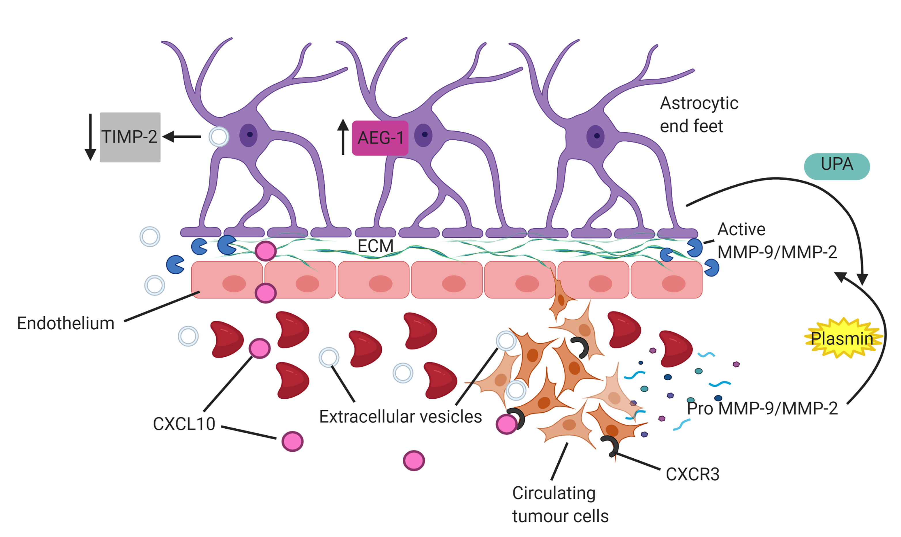 Fig. 2.Astrocytes facilitate invasion of circulating tumour cells (CTCs). Astrocytes produce matrix metalloproteinases (MMPs) and induce cleavage of tumour derived MMP-2/MMP-9 via activation of plasmin through interactions with urokinase-type plasminogen activator (UPA). Upregulation of astrocyte elevated gene 1 (AEG-1) enhances release of MMP’s into tumour microenvironment. Uptake of tumour cell derived extracellular vesicles into astrocytes downregulates expression of tissue inhibitors of MMPs (TIMP-2), subsequently diminishing modulation of MMP expression. Astrocyte derived CXCL10 chemokine upregulates the receptor, CXCR3, on CTCs to enhance chemoattraction and migration of tumour cells.