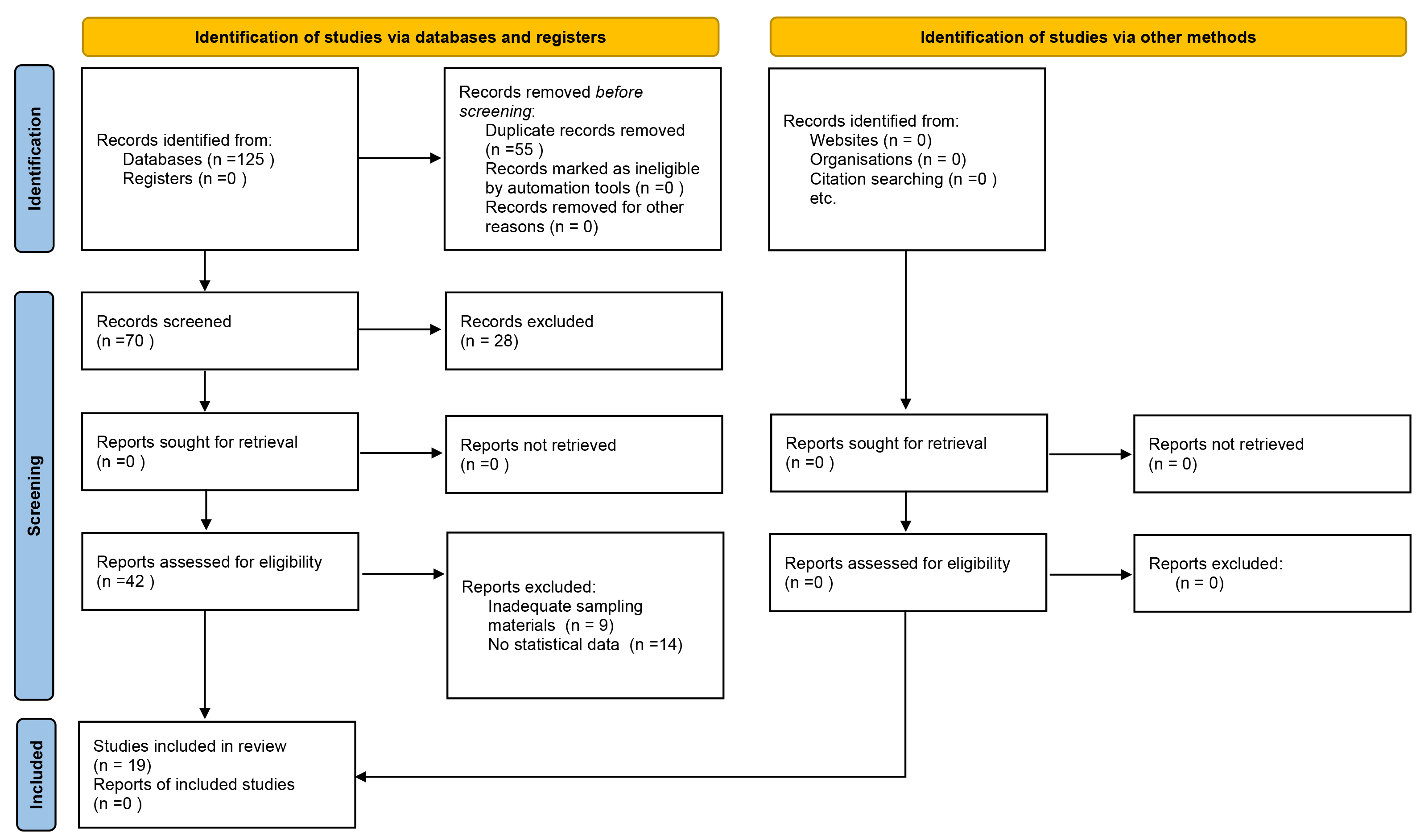 The initial search retrieved a total of 125 studies, from which 55 were excluded because of duplicate records. A total of 70 studies were screened based on the title and abstract, from which 28 were excluded, resulting in 42 full-text studies that were considered potentially eligible for inclusion. A total of 23 studies were excluded because of carried out using a mixture of contaminants including MPs and lack of statistical data analysis. Finally, 19 studies (6 in vitro, 11 in vivo and 2 both in vivo and in vitro) were included in this review [27, 28, 29, 30, 31, 32, 33, 34, 35, 36, 37, 38, 39, 40, 41, 42, 43, 44, 45].