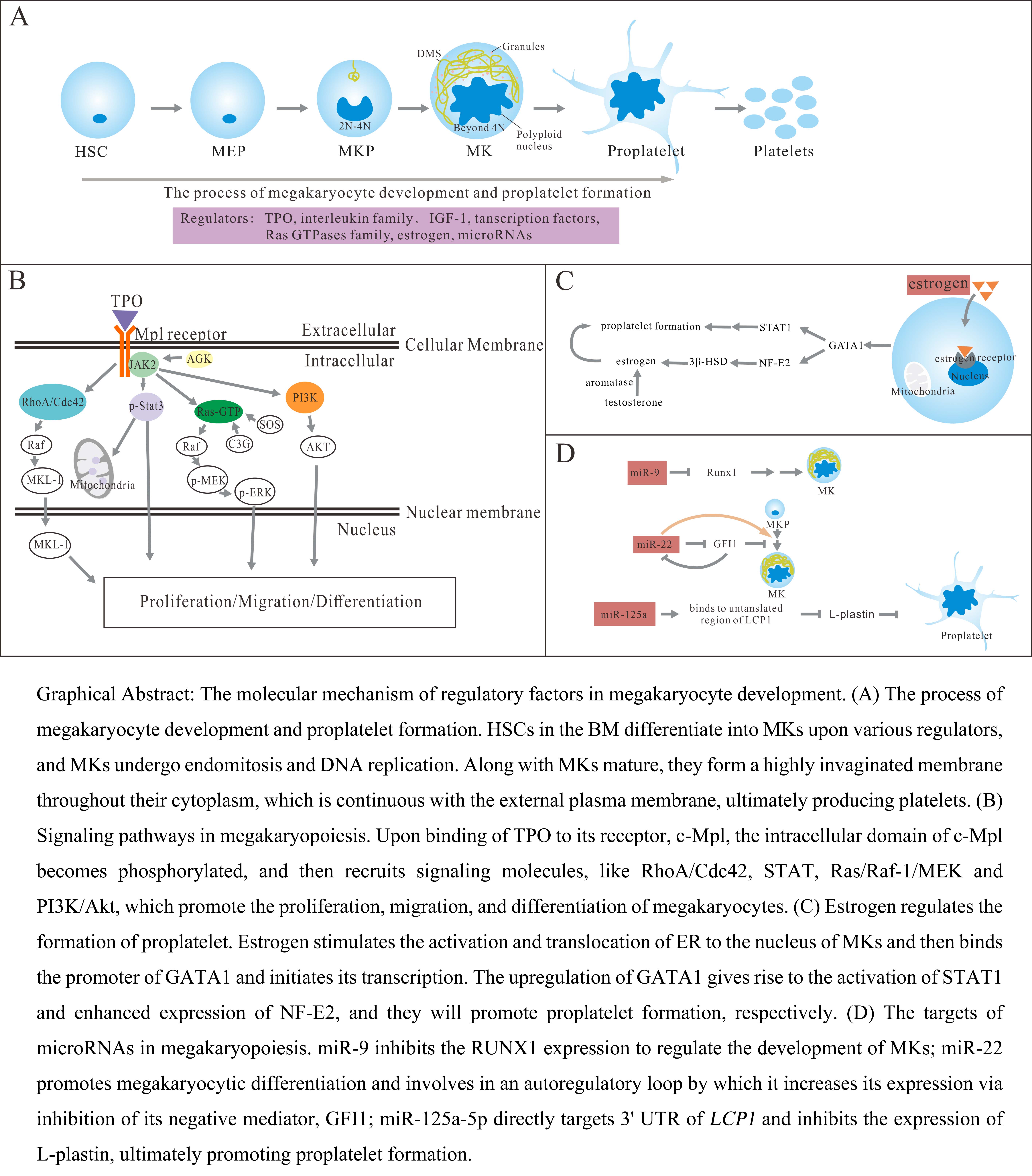 TPO/myeloproliferative leukemia virus (Mpl) receptor signaling pathway is the key pathway mediating megakaryocyte development and platelet production. TPO can bind to the Mpl receptor and then signal in megakaryocytes and HSCs, resulting in dimerization of the Mpl receptors and phosphorylation of Janus kinase2 (JAK2) downstream. Moreover, phosphorylation JAK2 will in turn phosphorylate Tyr626 and Tyr631 in Mpl, and then recruit signaling molecules containing the Src homology domain, like Stat family molecules [10, 11]. Besides, TPO also regulates megakaryocyte development and platelet production in other ways. The megakaryogenesis process involves the interplay of multiple transcription factors, which ensure the expression of a specific set of mRNA and protein during the development. Transcription factors and Ras GTPases family members have been found as critical roles in megakaryopoiesis and thrombocytopoiesis, and they may have important implications for in vitro platelet production. The deficiency of them affects multiple stages of hematopoiesis [12, 13], here we discuss the new effects of them in megakaryocyte-specification bias. Traditionally, it is believed that the bone marrow niche does not exhibit sex-dependent morphological differences, however, many studies have shown that estrogen has an important effect on the fate decision of hematopoietic cells [14, 15]. Moreover, estrogen is a potential contributor in megakaryopoiesis [16]. In recent years, microRNAs with a role in regulating gene expression attract the interest of researchers. The development of MKs needs protein translation to generate proplatelet, and MK-specific knockdown of the miR-processing enzyme Dicer leads to platelet counts decreasing [17]. More functional characterizations of microRNAs and their targets selection in different stages of megakaryocytopoiesis or thrombocytopoiesis can provide new insights for benefiting management approaches. In this review, we discussed the molecular mechanism of multiple cytokines and gene expression in different stages of thrombocytopoiesis, and they can regulate several hematopoietic lineage cell fate decisions and ensure that megakaryocytes mature correctly into final differentiated blood cells.
