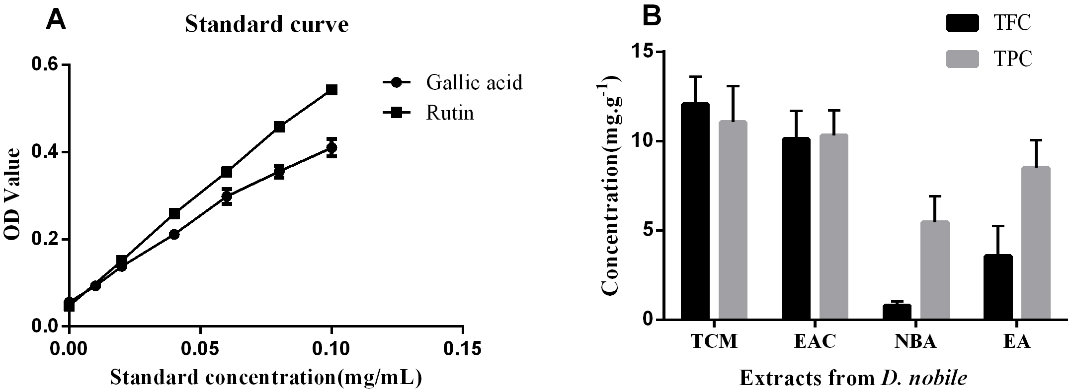 Fig. 1.Total flavonoid and phenolic contents of various polarity extracts from D. nobile. (A) Gallic acid and rutin standard curves. A rutin standard curve was used to determine the total flavonoid content (TFC) at 510 nm. At 760 nm, a gallic acid standard curve was used to determine the total polyphenol content (TPC). (B) The content of TFC and TPC in the extracts of each group. NC, negative control; AC, aging control; PC, positive control; EA, ethanol extract; TCM, chloroform extract; EAC, ethyl acetate extract; NBA, n-butanol extract; OD, optical density.