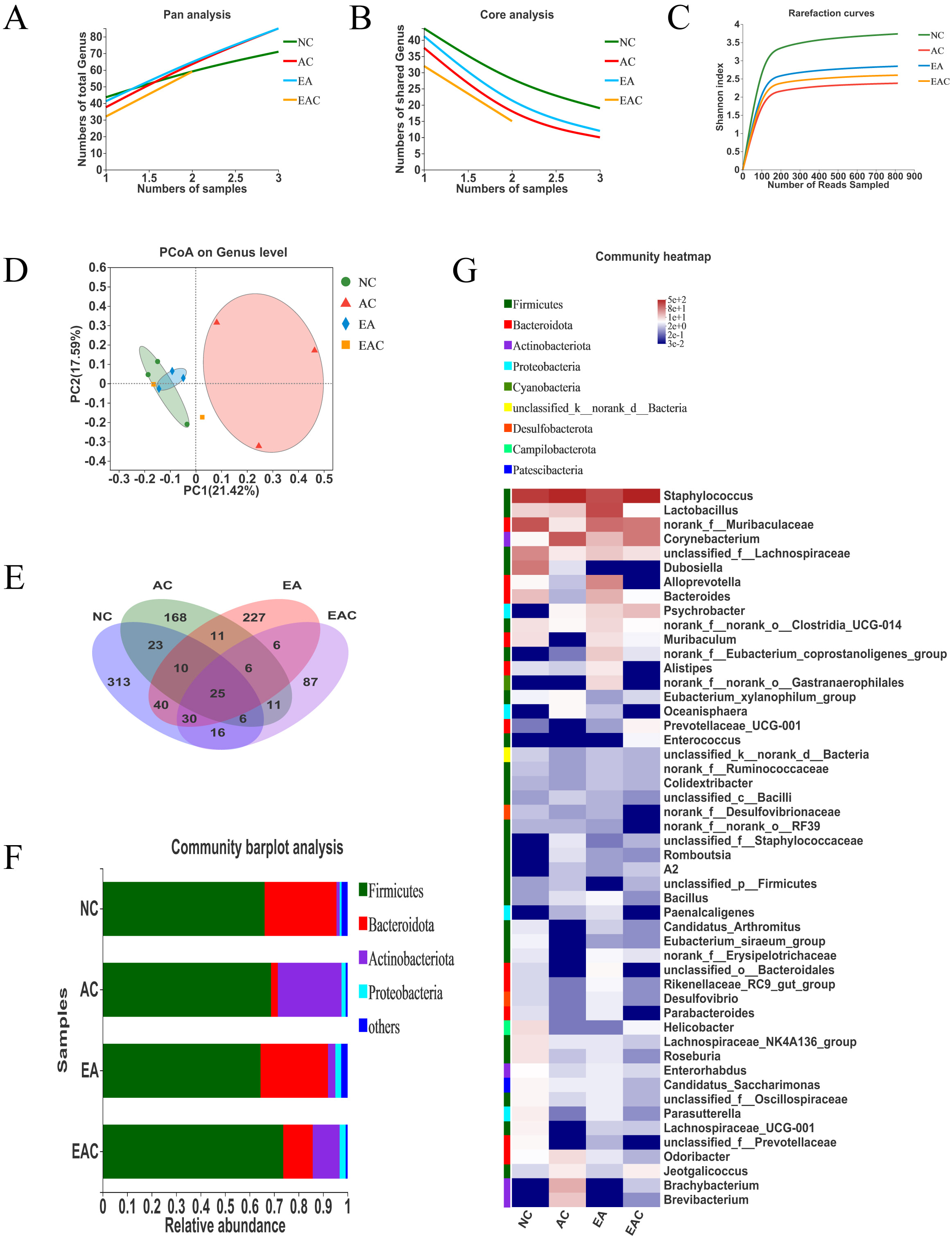 Fig. 6.Active ingredients of D. nobile regulate gut microbiota dysbiosis in aging mice. The colonic contents of mice in the EA, EAC, NC, and AC groups were selected for 16S rRNA sequencing to obtain ASVs for each sample, and the ASV data from each sample were drawn flat and processed. (A,B) The ASV data of the gut microbiota were based on Pan and Core species analysis at the genus level. (C) The ASV data of the gut microbiota were based on rarefaction curve analysis at the ASV level. (D) Venn diagram analysis of ASV data of gut microbiota based on ASV levels. (E) Unweighted UniFrac PCoA based on the genus level of gut microbiota ASV data. (F) Community Barplot analysis based on gut microbiota ASV data at the phylum level. (G) Community heatmap analysis of gut microbiota ASV data based on the genus level. NC, negative control; AC, aging control; PC, positive control; EA, ethanol extract; TCM, chloroform extract; EAC, ethyl acetate extract; NBA, n-butanol extract.