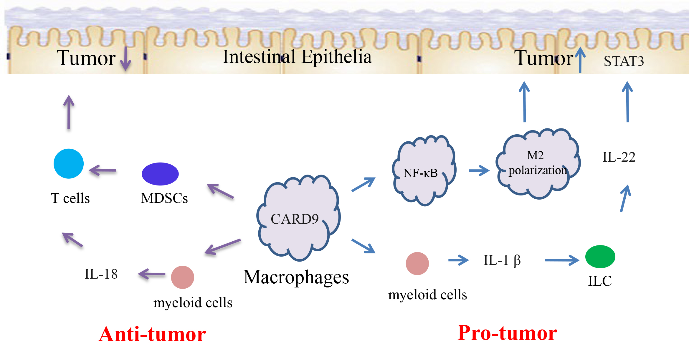 CARD9 has been confirmed to be critical for CRC development; however, to date the function of CARD9 in CRC is not well defined. Somestudies report a pro-tumor role of CARD9 in CRC, butothers have an anti-tumor role. These dual CARD9 mediated pro- and antitumor immune responses are required for further investigation.