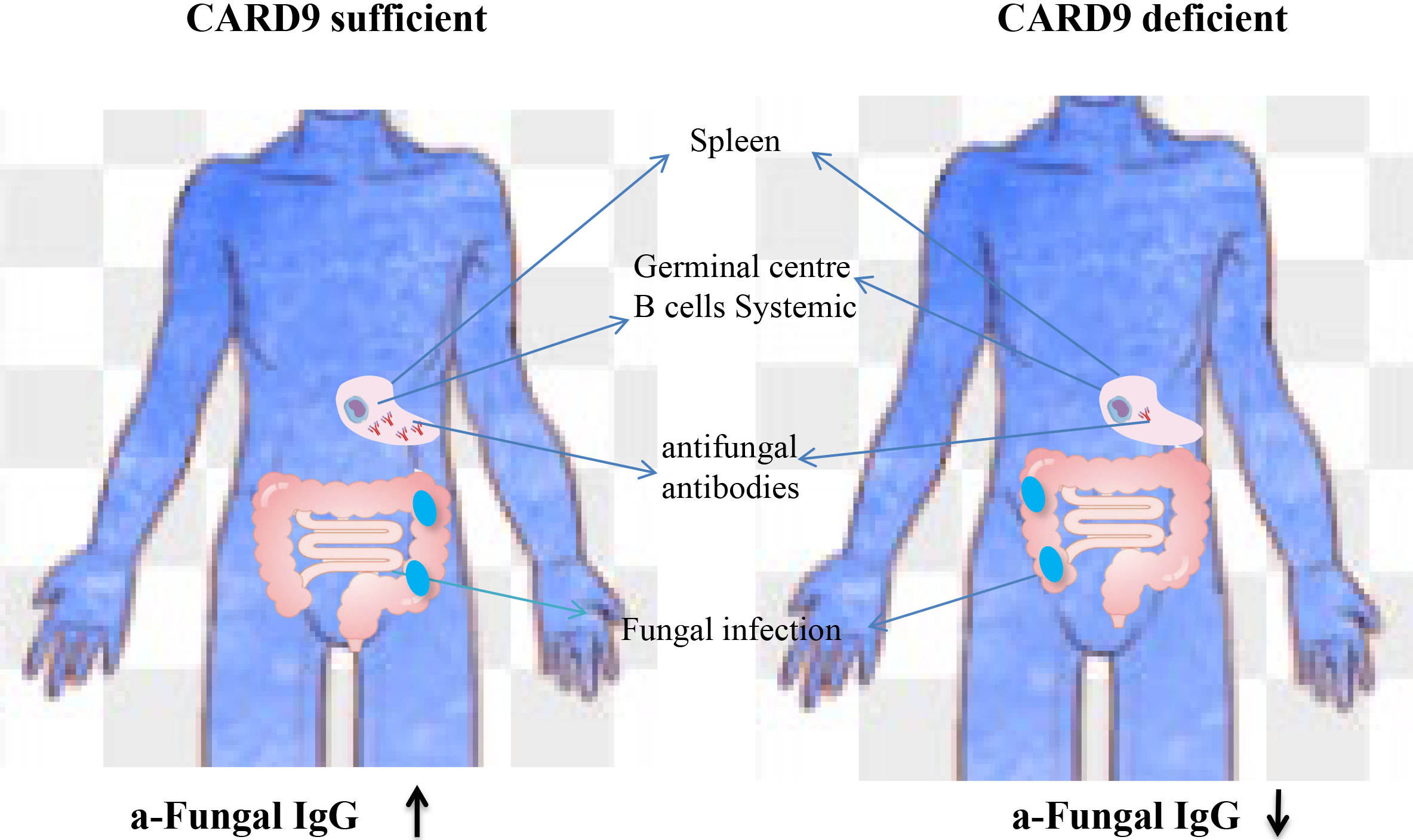 CARD9 is central to the regulation of host immune responses in the presence of various microbial infections. Interestingly, in addition to fungal infections in the gut, CARD9 activity also correlates with certain bacteria and viruses. These CARD9 mediated interactions are critical in providing further insights into the complex interplay among the microbiota, the immune system and cancer development. Of note, a new study demonstrates that CARD9 signal in macrophages boosts systemic antifungal IgG antibodies production by germinalcentre B cells, leading to humoral antifungal immunity. As a result, mycobiota-induced IgG antibodies have a protective capability in gut fungal infections, suggesting that, in the future, potential vaccines and antifungal therapies could be developed to prevent colorectal cancer.
