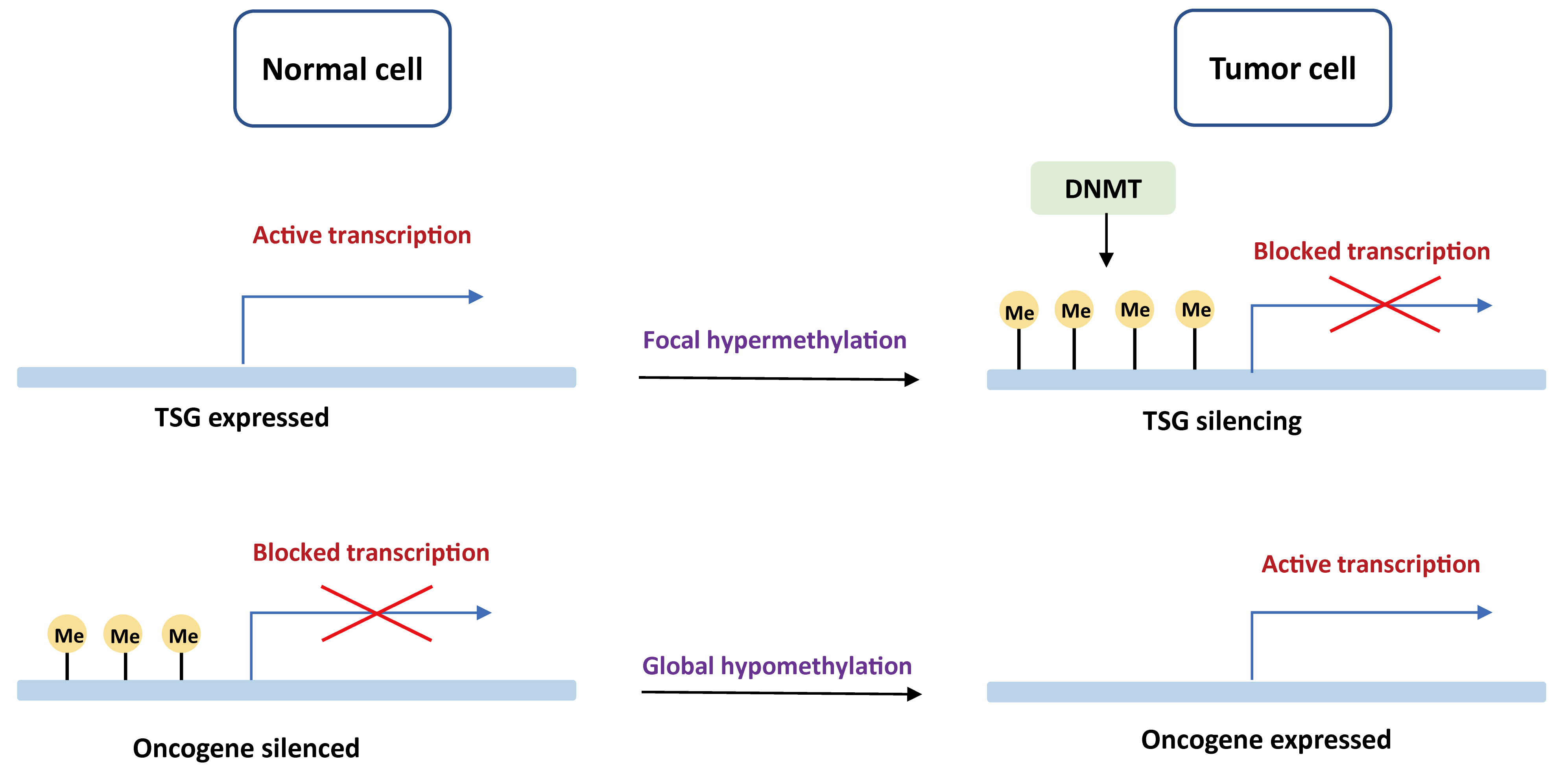 Fig. 1.Basic mechanisms of oncogenesis induced by DNA methylation. In normal cells, tumor suppressor genes are demethylated and expressed, while oncogenes are methylated and unexpressed. In the tumor cells, tumor suppressor genes are blocked by DNA de novo methylation with DNMT, whereas oncogenes are actively transcribed due to global hypomethylation. TSG, tumor suppressor gene; DNMT, DNA methyltransferase.