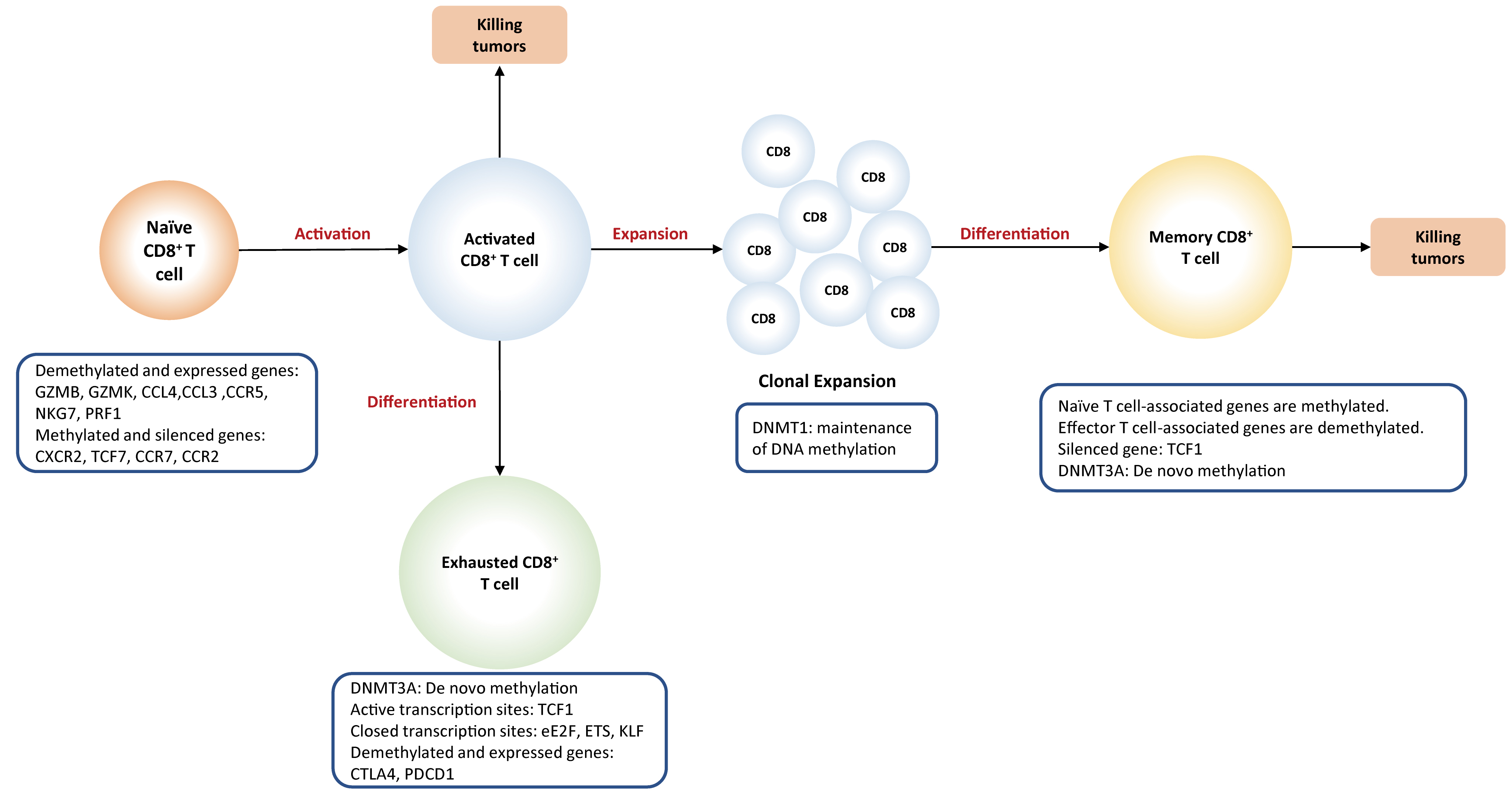 Activation of naïve T cells initially requires the interactions between T cell receptor (TCR) present on T cells and MHC complex (signal 1) expressed on antigen-presenting cells (APC), followed by the activation of co-stimulatory molecules (signal 2) provided by mature dendritic cells. When both signals are present, T cell activation initiates an autonomous intracellular signaling cascade, leading to T cell expansion and differentiation. Global DNA methylation remodeling plays a critical role in priming and activation of cytotoxic effector T cells. For example, demethylation at a promoter-enhancer region of the IL-2 loci, significantly drives the increased levels of IL-2 cytokines that are required for T cell activation and proliferation [62]. Promoter demethylation is observed in several effector genes, such as GZMK and GZMB [53].