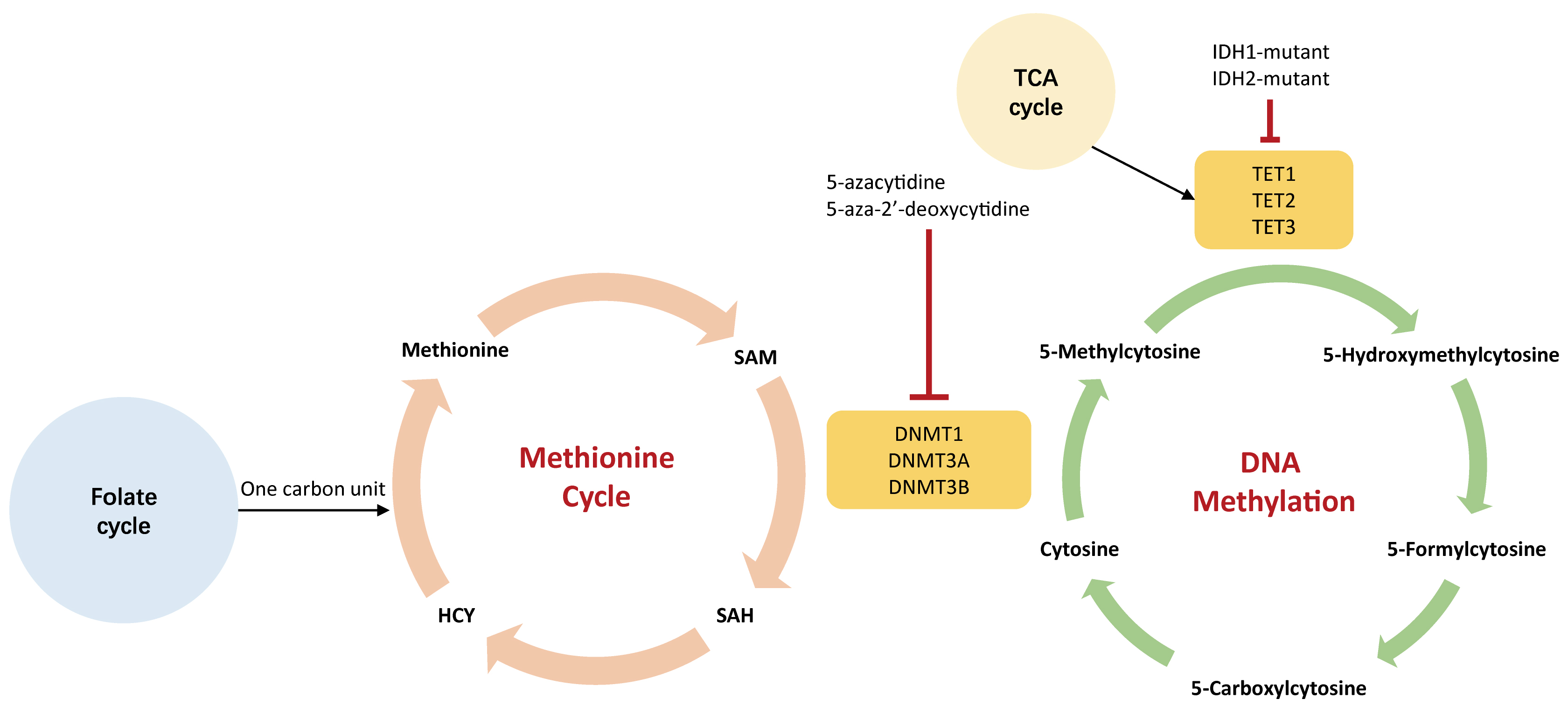 Fig. 5.The association between DNA methylation and metabolism. The green cycle represents DNA methylation that occurs on genome; the orange cycle indicates methionine cycle that generates SAM in the cytoplasm. The 5-carbonxylcytosine could be methylated to form 5-methylcytosine by DNA methyltransferases (DNMTs), including DNMT1, DNMT3A, and DNMT3B. Small molecules agents, such as 5-azacytidine and 5-aza-2’-deoxycytidine, could inhibit the activity of DNMTs leading to hypomethylation. These hypomethylating agents are used to treat a variety of human tumors. IDH1-2, isocitrate dehydrogenase 1-2; HCY, homocysteine; SAM, S-adenosylmethionine; SAH, S-adenosylhomocysteine; DNMT, DNA methyltransferase; TET, ten-eleven translocation demethylase.