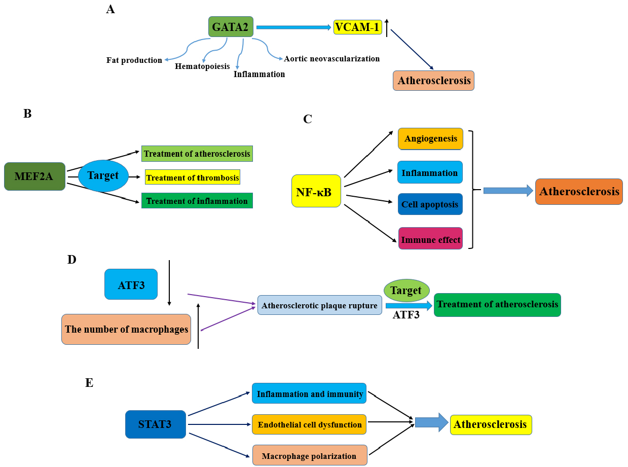 | GATA2 | The GATA binding protein 2 (GATA2) | Various biological processes are regulated by GATA2 to indirectly or directly affect the progression of atherosclerosis, including aortic neovascularization, hematopoiesis, adipogenesis, and inflammation. It is important to function ECs and aortic smooth muscle cells and maintain progenitor/hematopoietic cells. GATA2 also enhances the adhesion of monocytes and facilitates diapedesis through the vascular walls by the upregulation of VCAM-1, further revealing its pro-atherosclerotic effect. The GATA2-ADTRP pathway is associated closely with the endothelium’s activation and function and thus drives atherosclerosis development. |