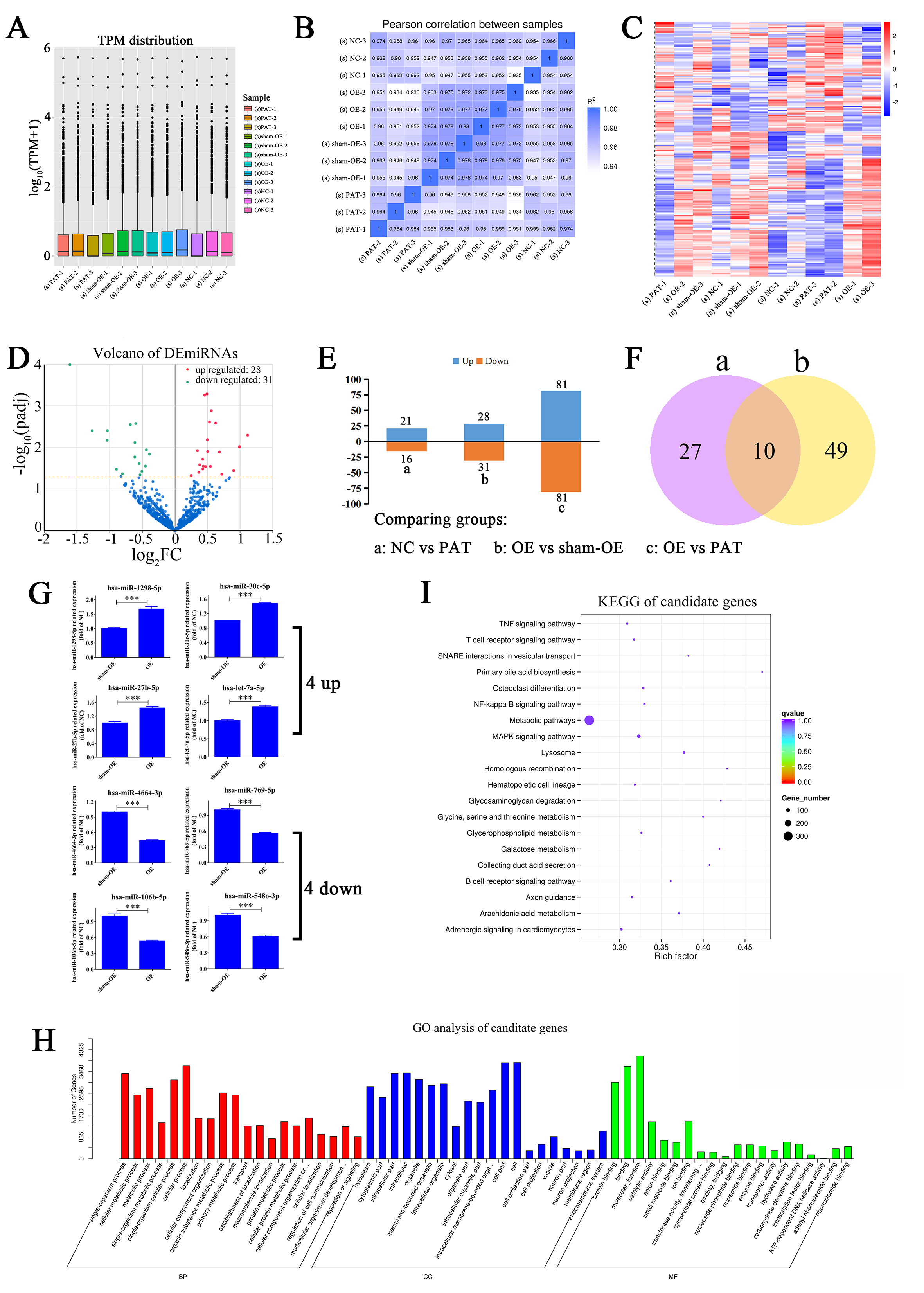 (D) of DEmiRNAs expression profiles between OE and sham-OE. (E) The number of