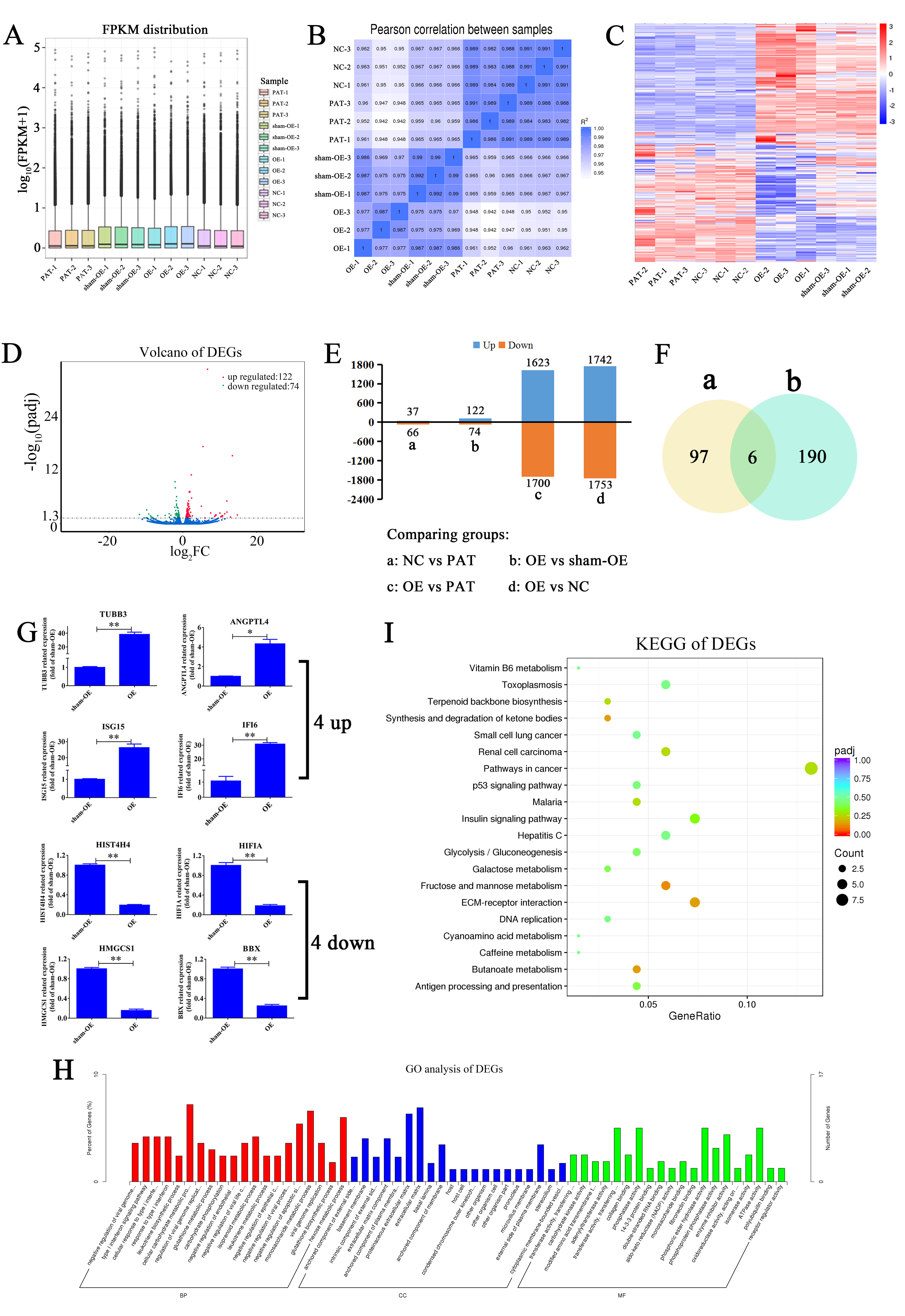 plot (D) of DEGs expression profiles between the OE and sham-OE groups. (E) The