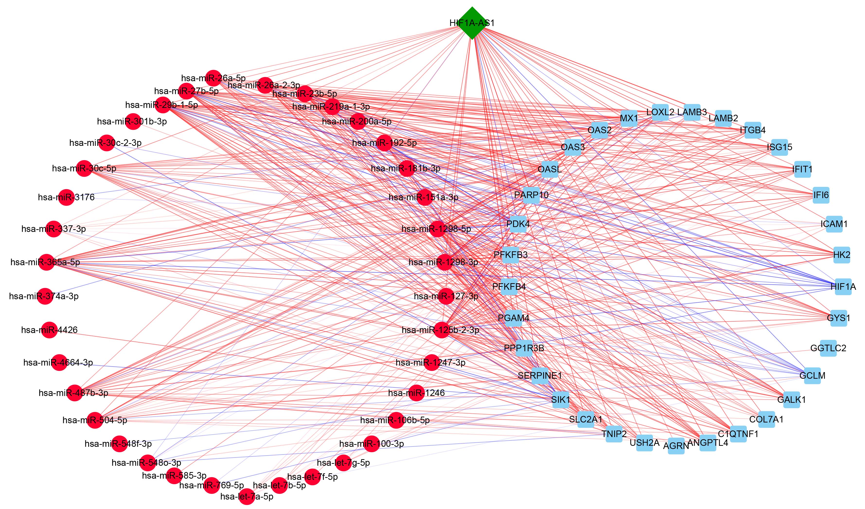 Another study, which was published recently, showed that some lncRNAs regulate various cellular processes by acting as competing endogenous RNAs (ceRNAs) and binding proteins. For example, HIF1A-AS1, acting as a ceRNA, absorbed miR-204 to evaluate Suppressor of Cytokine Signaling 2 expression in cardiac function [21]. This lncRNA participates in the regulation of proliferation, apoptosis, and the activity of the extracellular matrix proteins of VSMCs [18, 49]. Abundant evidence has indicated that this lncRNA might participate in the development of CVD by regulating the PA-induced apoptosis of HUVECs [23]. However, the molecular mechanism by which HIF1A-AS1 interacts with miRNAs and mRNA and their regulatory roles of pathogenesis are unclear. HIF1A-AS1 has potential as a novel therapeutic target in CVD, but underlying information about the regulatory mechanisms in HUVECs is lacking.