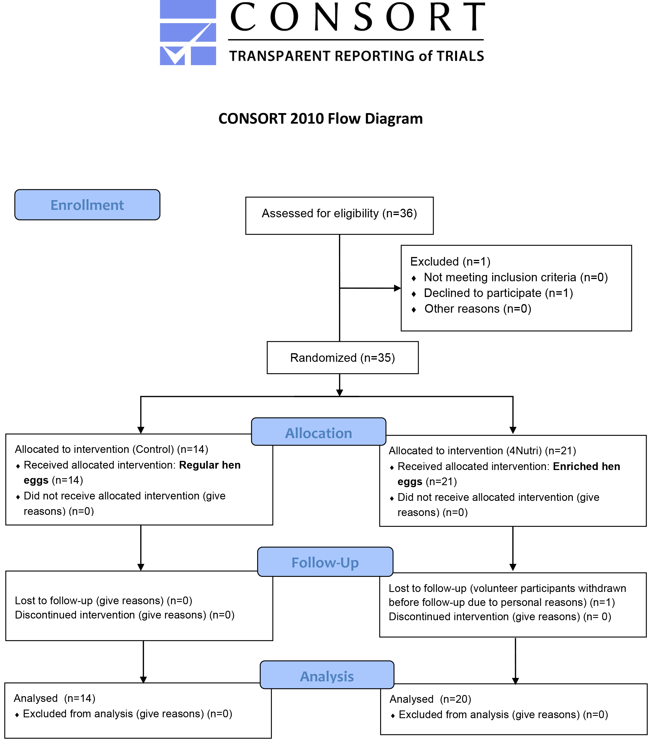 Study participants were instructed to follow their usual meal schedule and to avoid any supplements (e.g., n-3 PUFAs or vitamin E, selenium and lutein). They were advised to consume only the eggs provided for them during the study, preferably in the mornings after boiling them for 10 minutes. Each respondent recorded what he/she consumed over the duration of the study protocol in a diet diary in form of 24 hours recalls, designed and previously published by our research group [20]. Blood samples were taken on the first and last day of the study protocol for the purpose of serum collection and peripheral blood mononuclear cell isolation. A CONSORT diagram is presented in Fig. 1; a CONSORT checklist is presented in Supplementary Table 1.