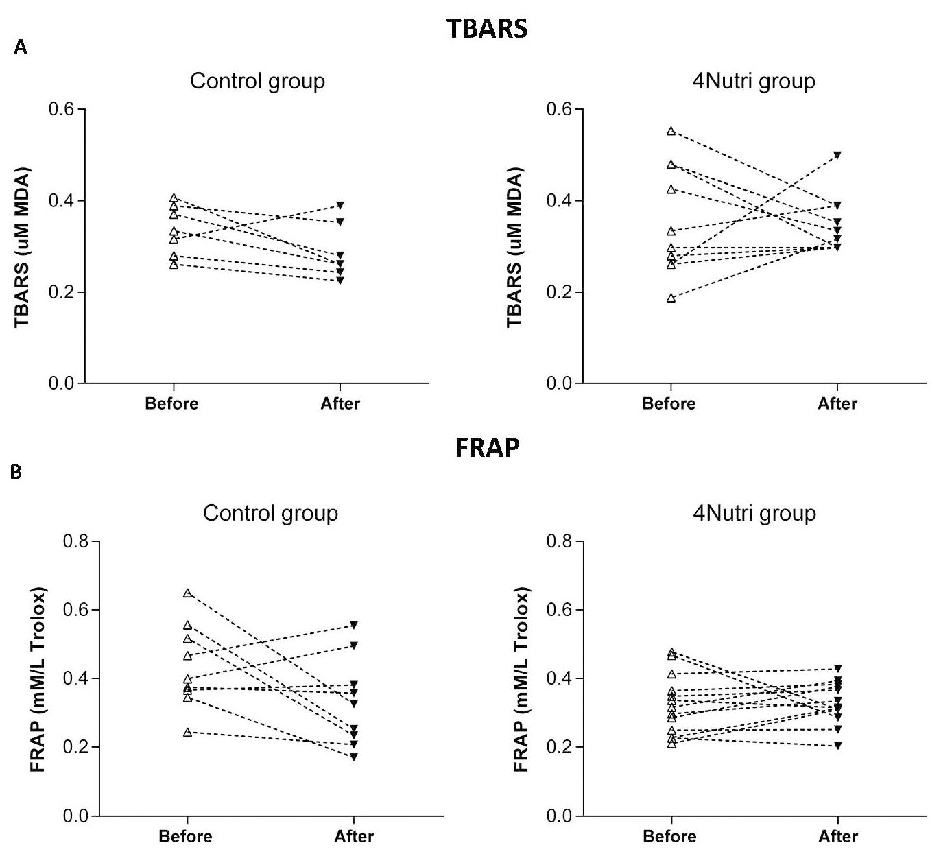 Fig. 2.Effects of regular (Control group) and enriched hen eggs (4Nutri group) consumption on the serum levels of oxidative stress (TBARS) (A) and antioxidant capacity (FRAP) (B) after three-week diet protocol. Effects of regular (Control group) and enriched hen eggs (4Nutri group) consumption on the serum levels of oxidative stress (TBARS) (A) and antioxidant capacity (FRAP) (B) after three-week diet protocol. Both diets didn’t significantly alter neither marker after respective diet protocols. Paired t-test; significance level p